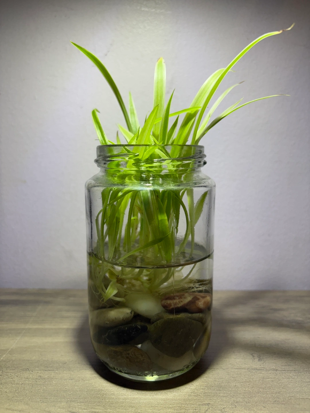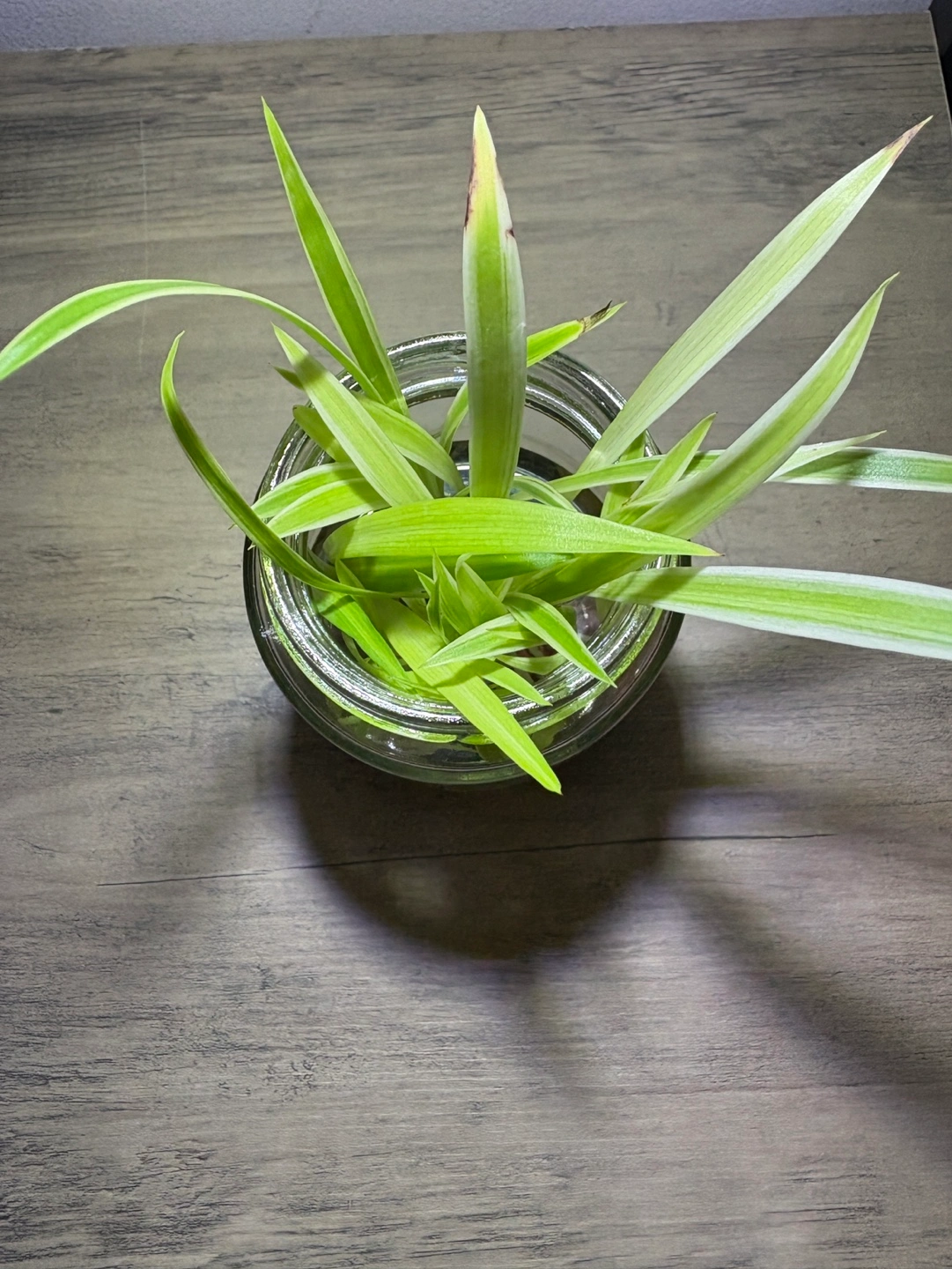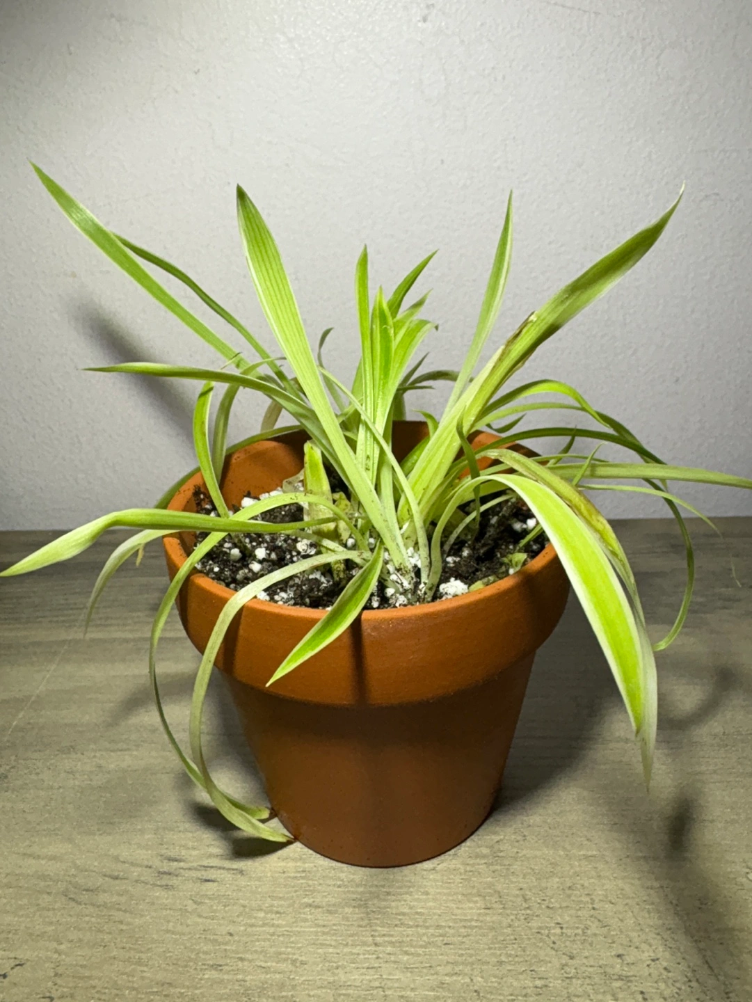 Healthy, thriving baby spider plant with lots of roots grown and ready to be established in soil. Recently added fertilizer in February. This wonderful beginner plant cleans the air in your house and is safe for pets.