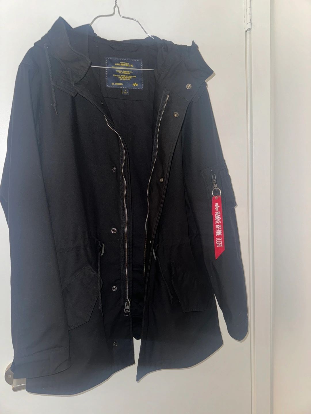 Men's black parka. Features a hood, zip closure, multiple pockets, and drawstring waist. Good condition. Remove before flight keychain included.