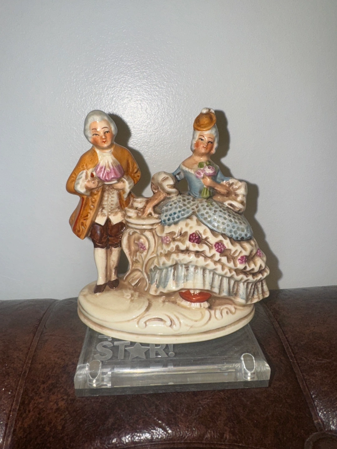 Charming vintage porcelain figurine. Depicts a man and woman in period costume. Detailed clothing and features. Oval base. Collectible item.