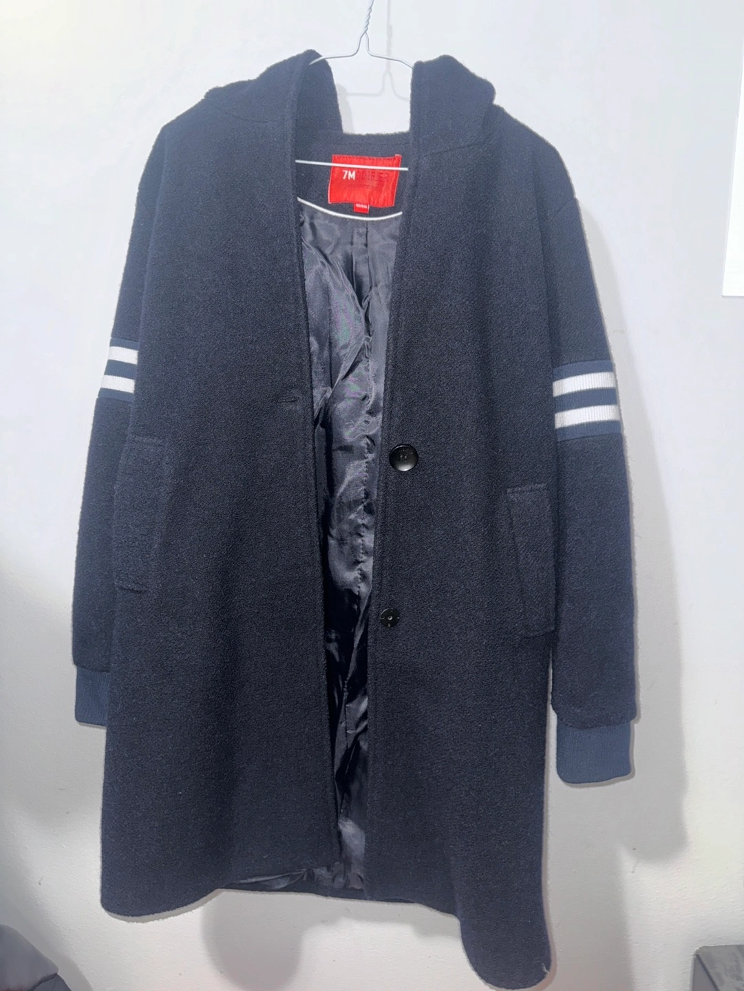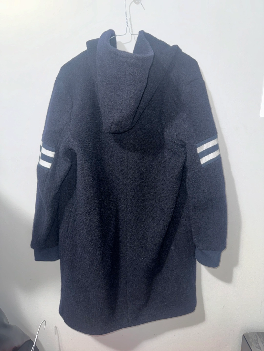 Dark grey hooded peacoat. Features white stripes on sleeves. Single button closure. Size 160/84A.