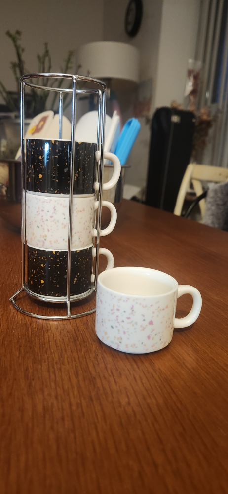 Four single shot espresso mugs, black and white speckled design. Includes metal stand. Perfect for nespresso or espresso.