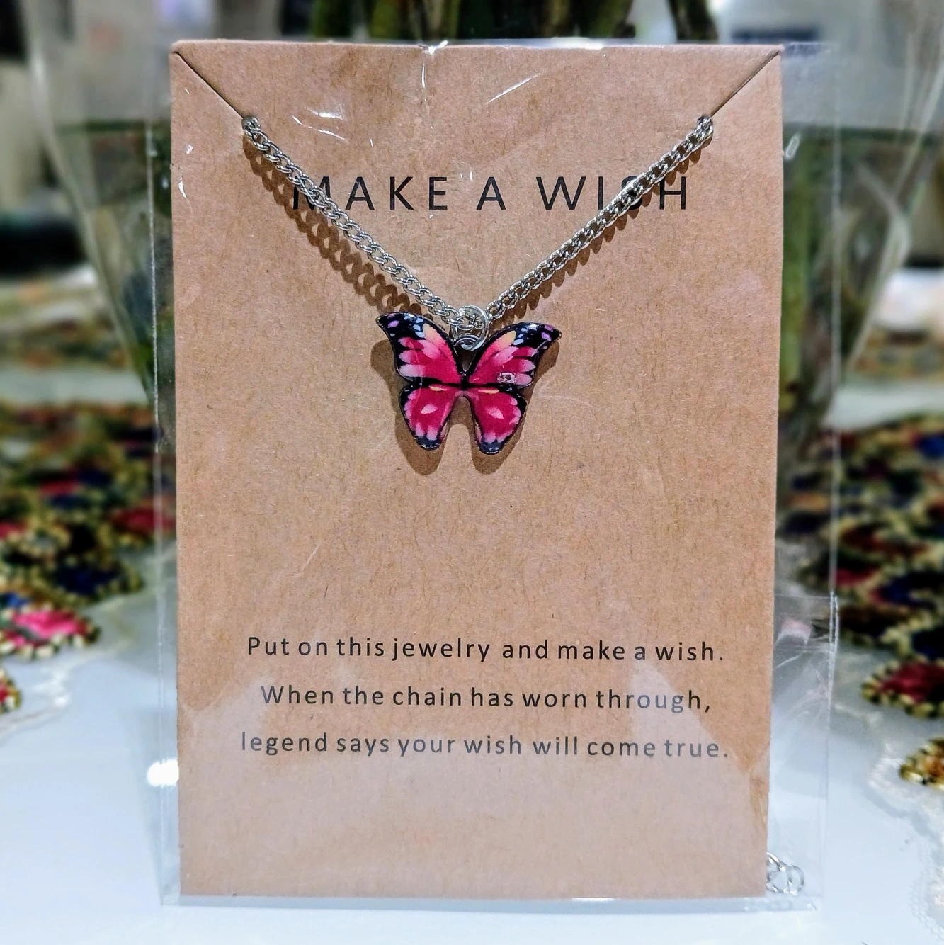 Dainty silver chain necklace. Features a pink butterfly charm. Make a wish when you put it on; legend says your wish comes true when the chain wears through.