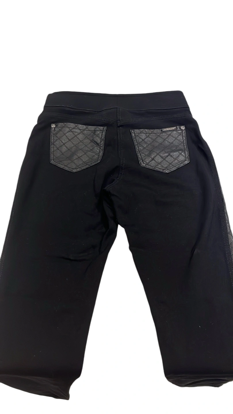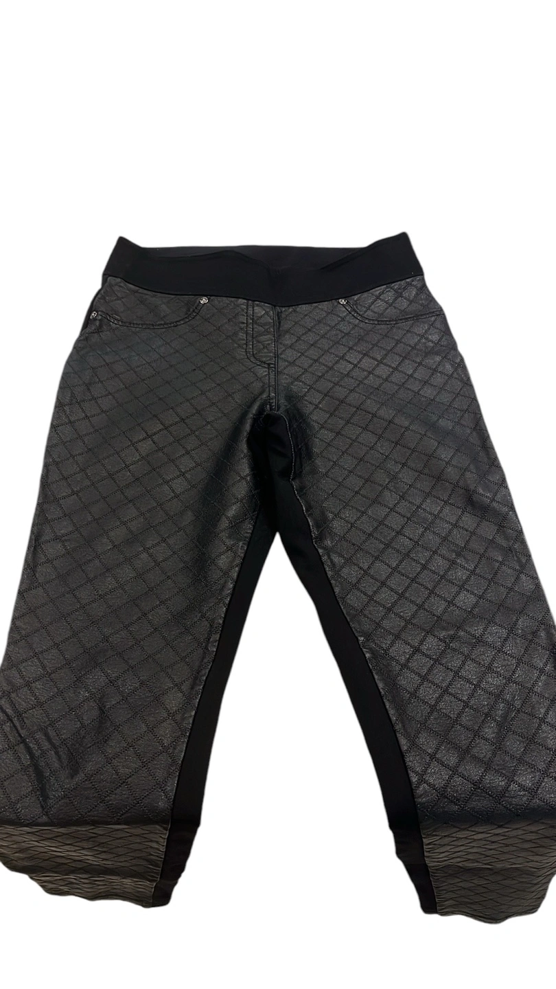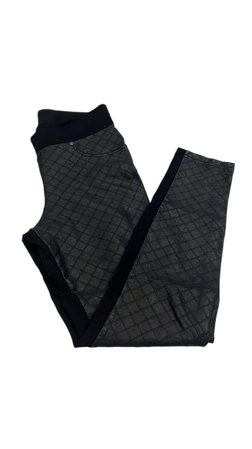 Black quilted leggings. Features a unique quilted pattern in vegan leather and back pockets. Stretchy material. Excellent for casual wear and high boots. Rise 10”. Inseam 26.5”
