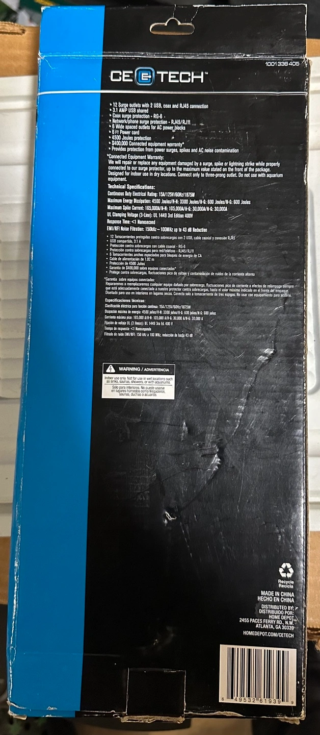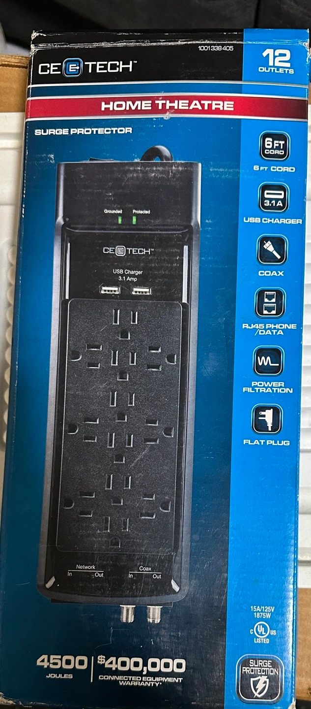 9912 surge outlets with 2 USB ports and RJ45 connection. 8ft power cord. 4500 Joules surge protection. $400,000 connected equipment warranty. Flat plug.