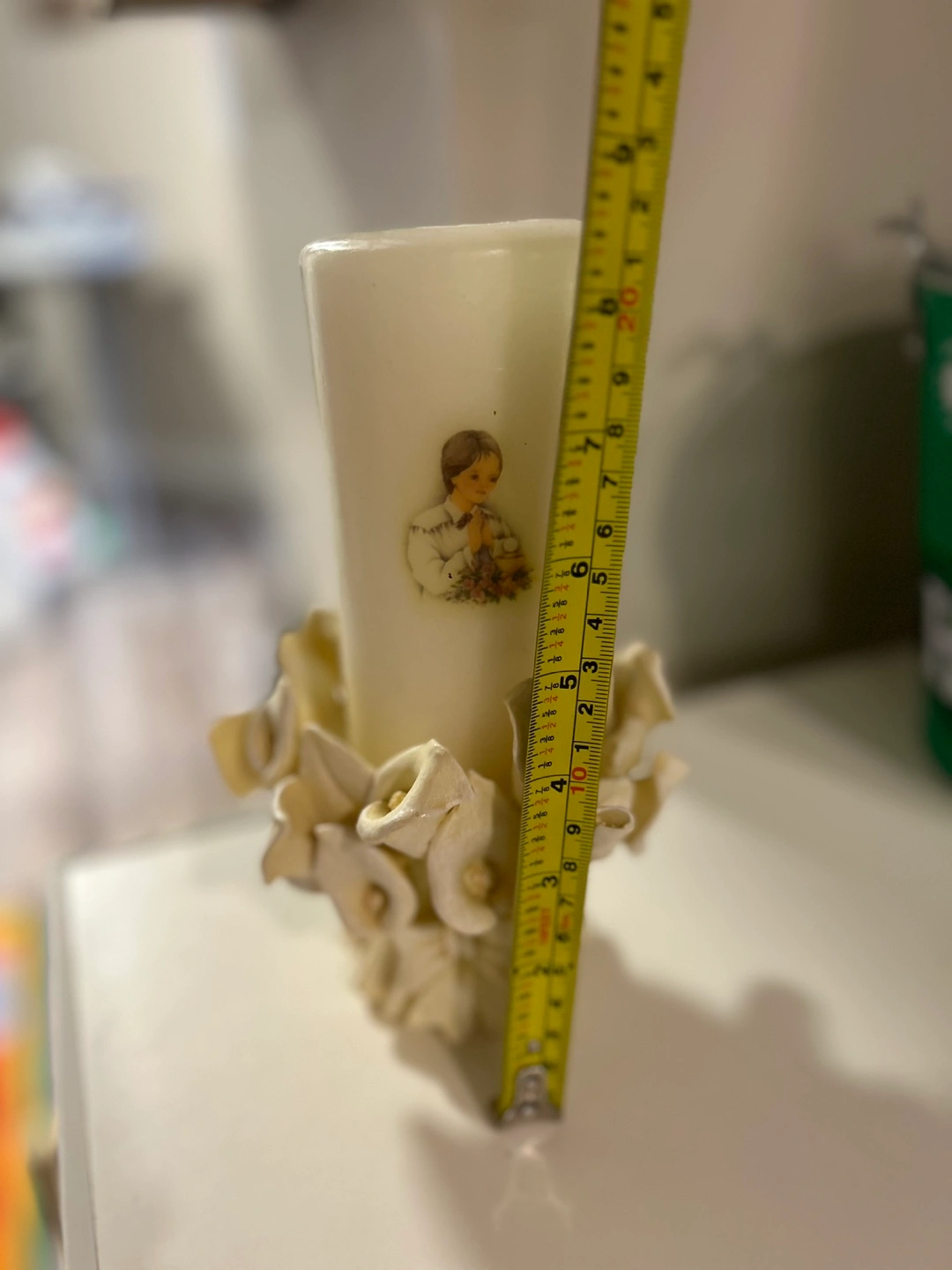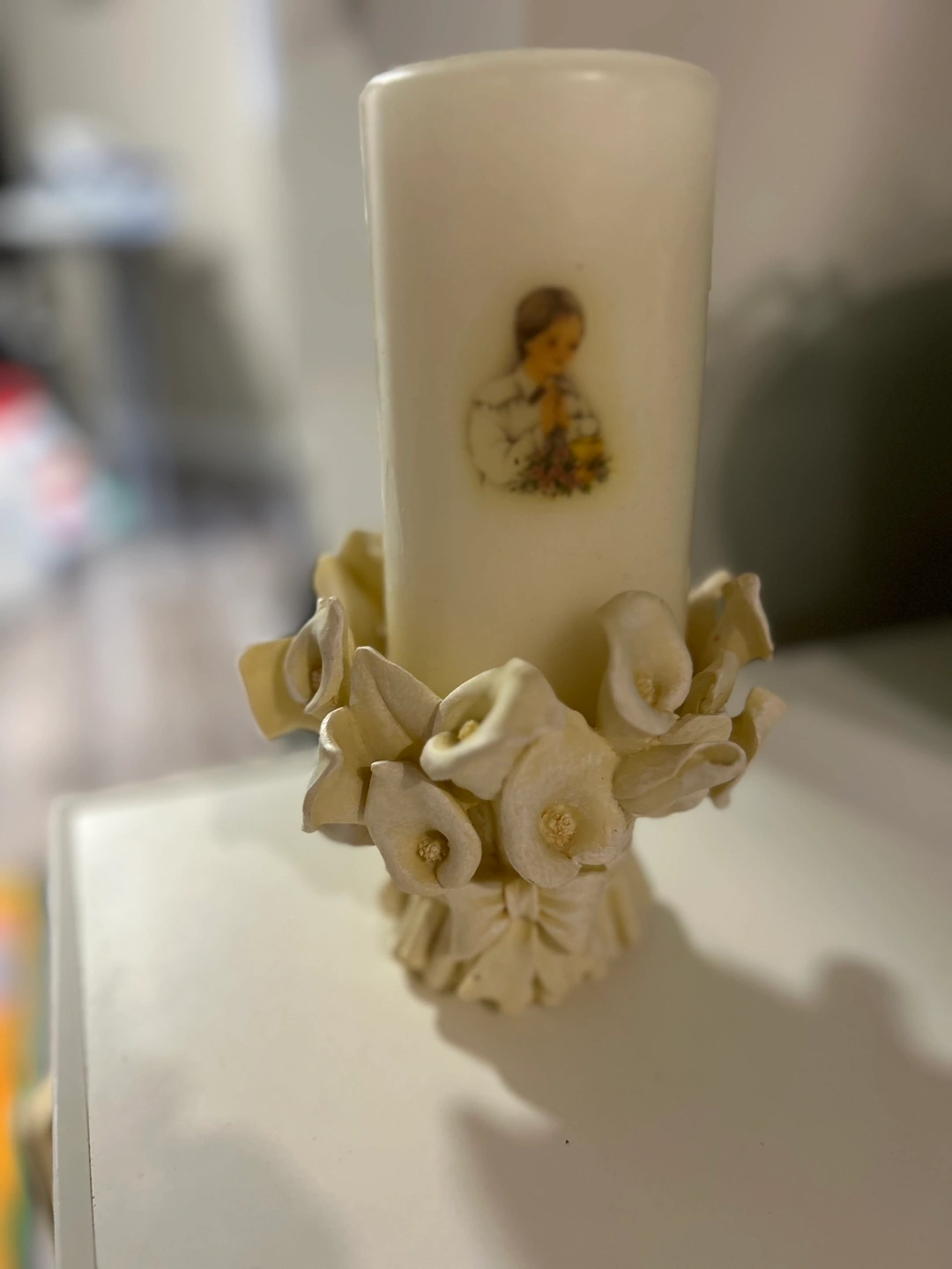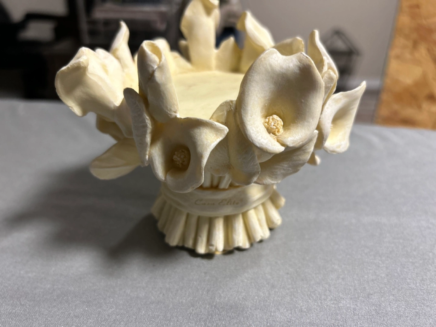 Adorable off-white candle holder. Features a bouquet of calla lilies. Designed by M. Valenti. Measures approximately 5 inches in diameter.