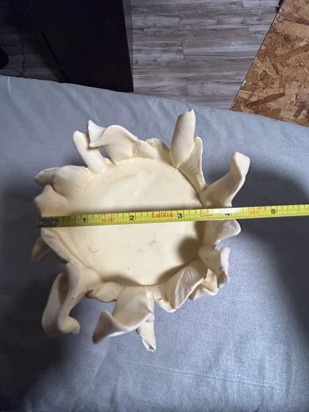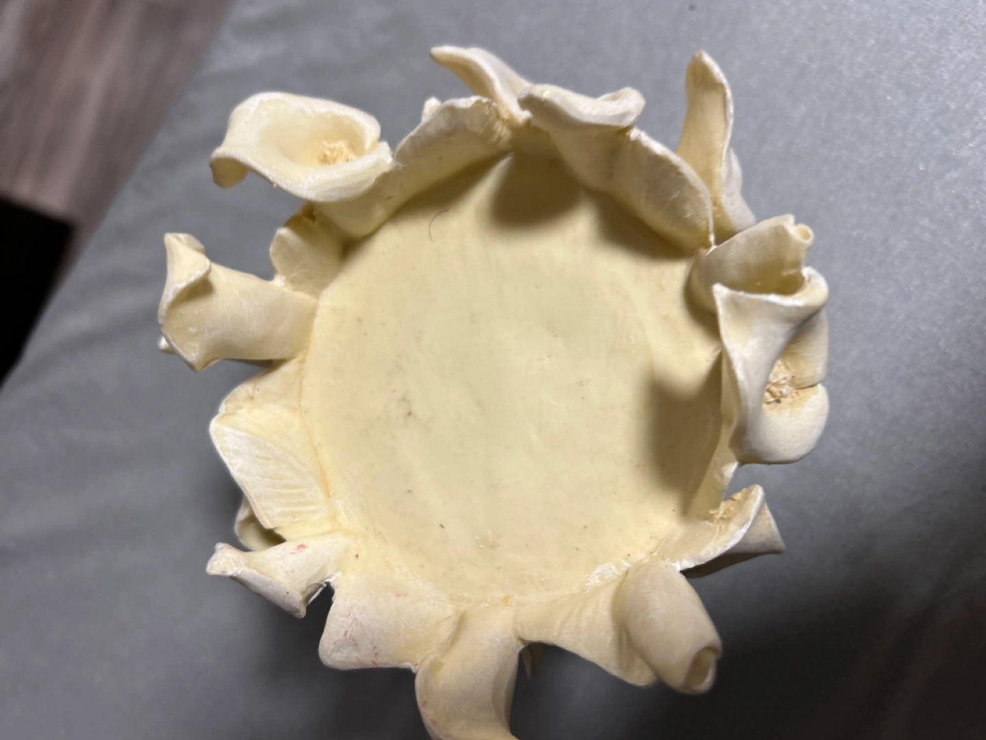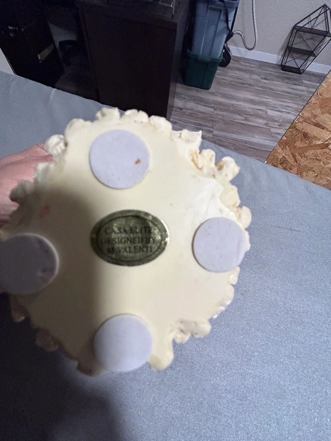 Adorable off-white candle holder. Features a bouquet of calla lilies. Designed by M. Valenti. Measures approximately 5 inches in diameter.
