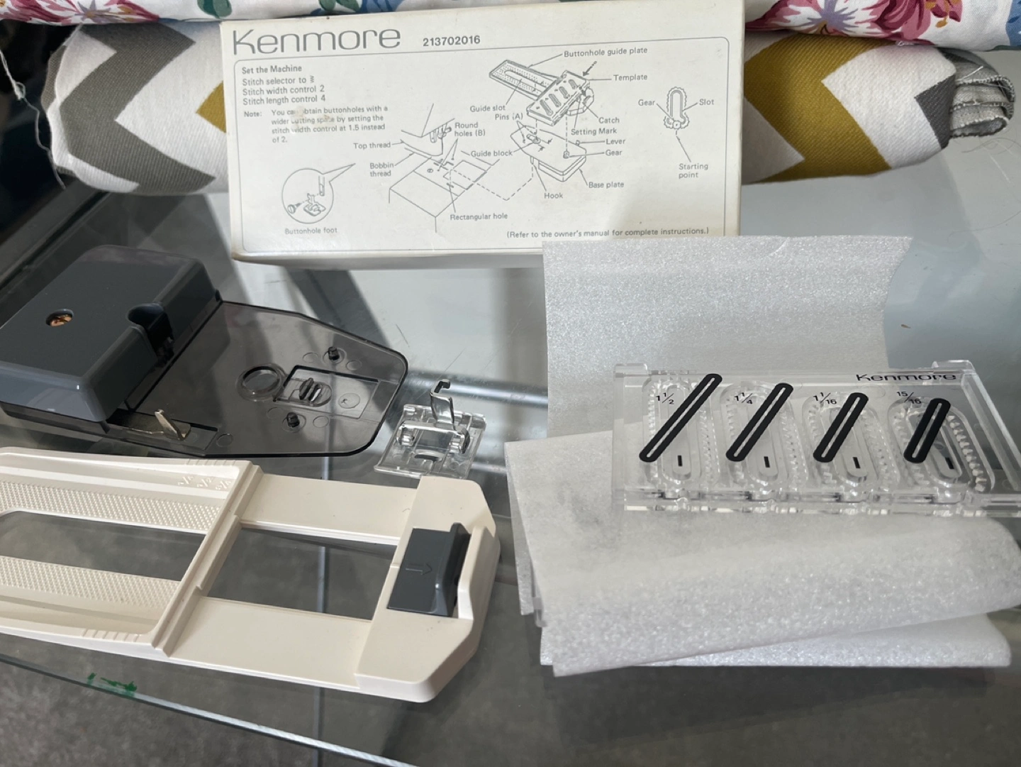 Vintage Kenmore buttonhole attachment. Includes all parts shown in photos. Complete with instructions. Sewing machine accessory.