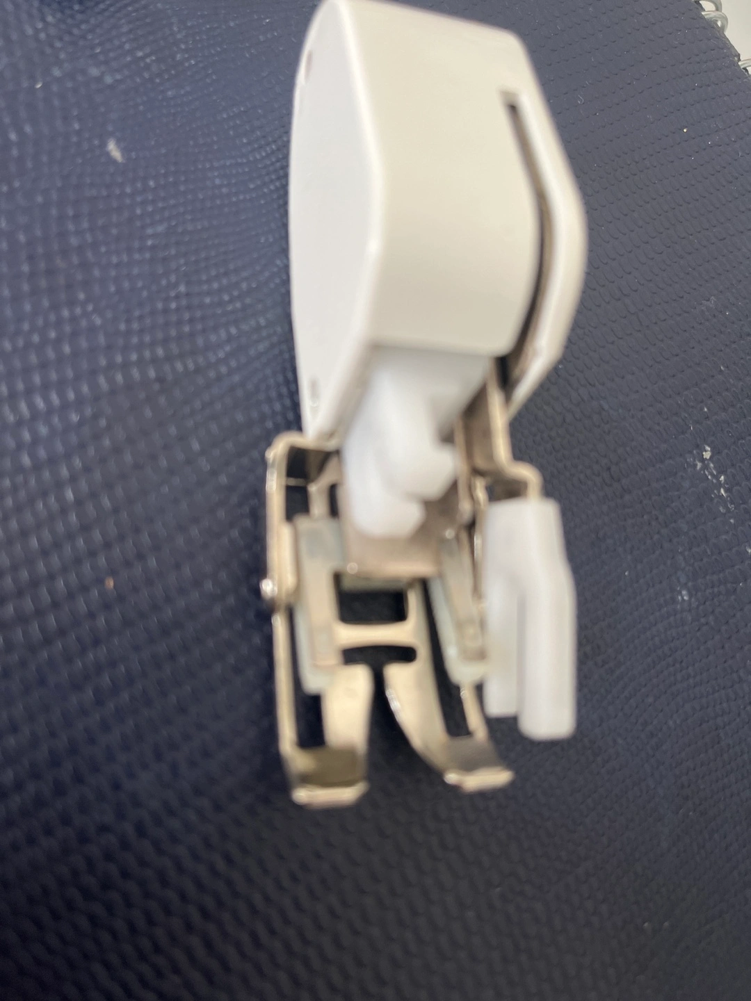 Used sewing machine presser foot. White plastic top. Metal base. Looks like a walking foot.