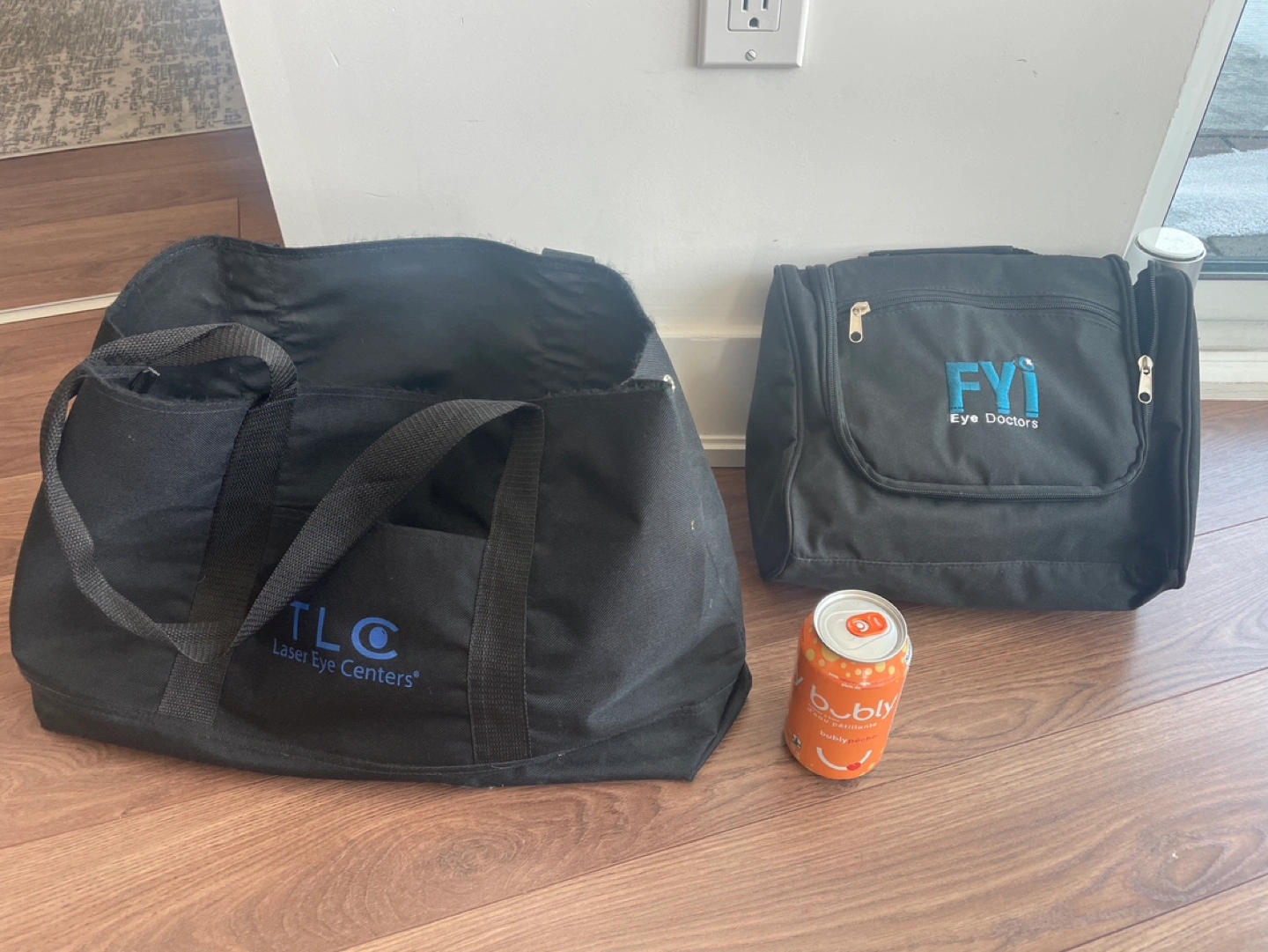 One larger tote bag from TLC Laser Eye Centers. One smaller travel bag from FYI Eye Doctors.