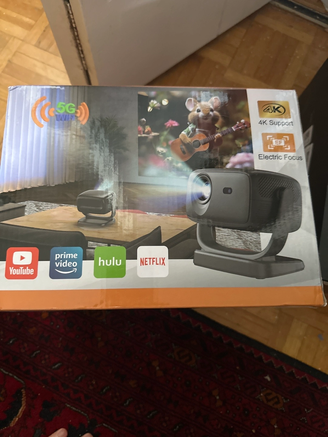 Outdoor movie projector. Features electric focus, keystone correction, and zoom. 220" big display. Built-in streaming apps & 2GB+16GB ROM storage. Dual-band WiFi 6 for smooth, stable connection. 4K Ultra HD support. Includes remote.