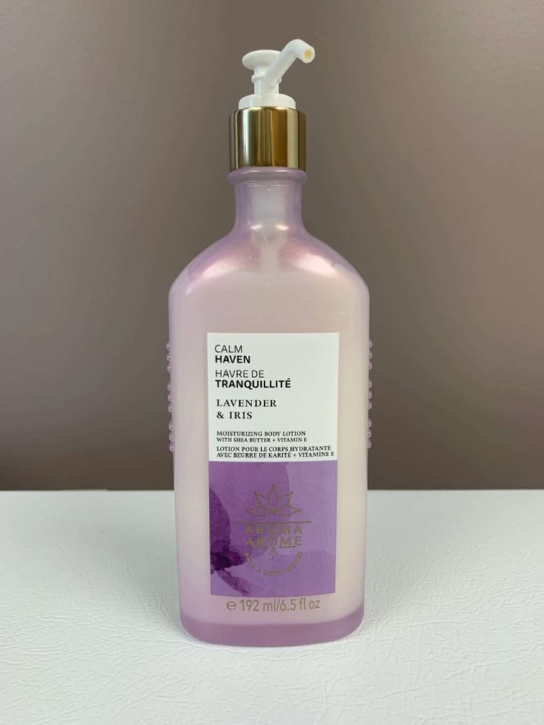 Aroma Calm Haven body lotion. Lavender and iris scent. Moisturizing formula with vitamin E, aloe, and shea butter. Pump dispenser.