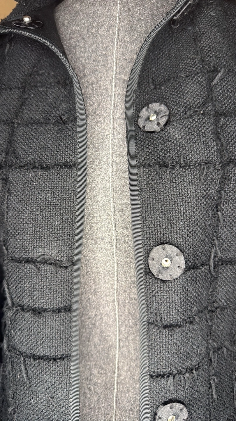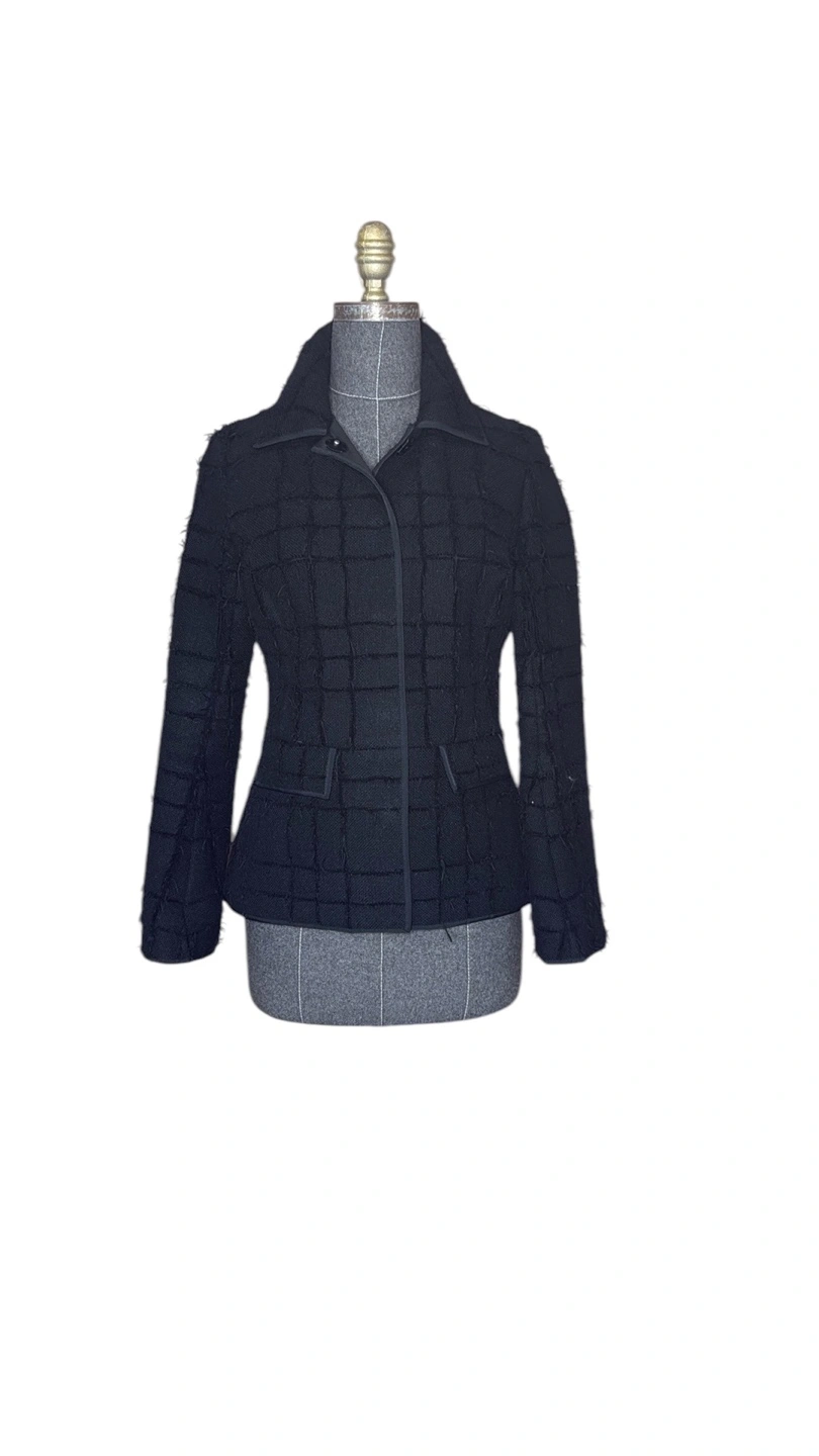 Women's black textured fabric fitted blazer. Features a grid pattern, long sleeves, and a collared neckline. Has a fitted silhouette and functional pockets. Made in Canada, pit to pit 19” length 25”