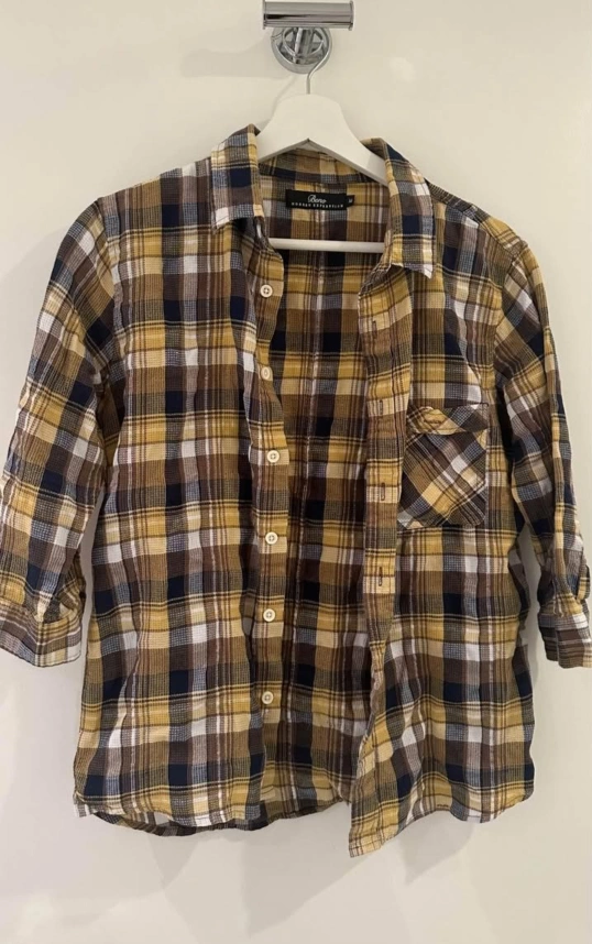 Pero brand. Mustard yellow, brown, and navy plaid. Three-quarter sleeves. Button-down closure. Chest pocket.