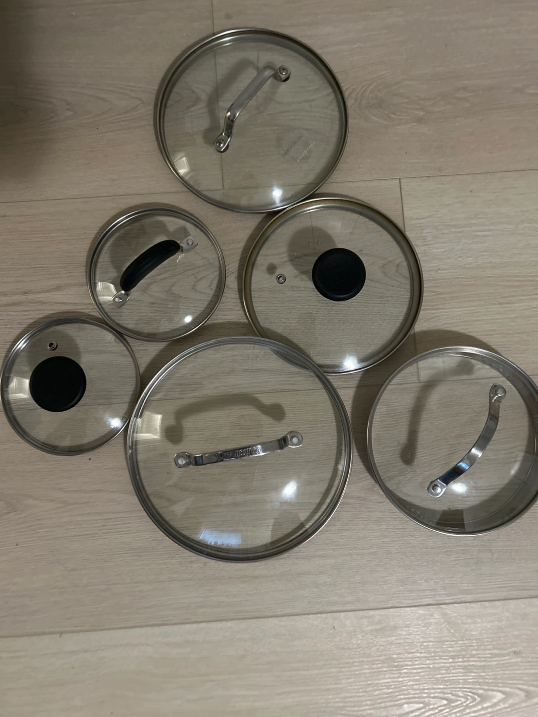 Set of seven glass lids, various sizes. Masterclass Premium Cookware brand. Great for replacing missing lids or adding to your cookware collection. Metal handles and knobs.