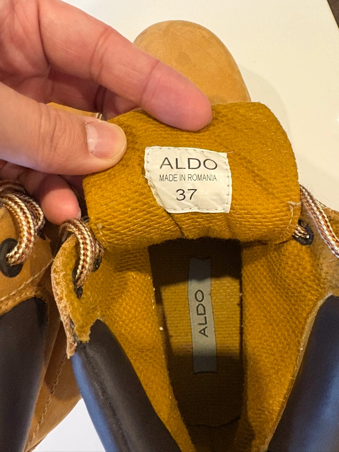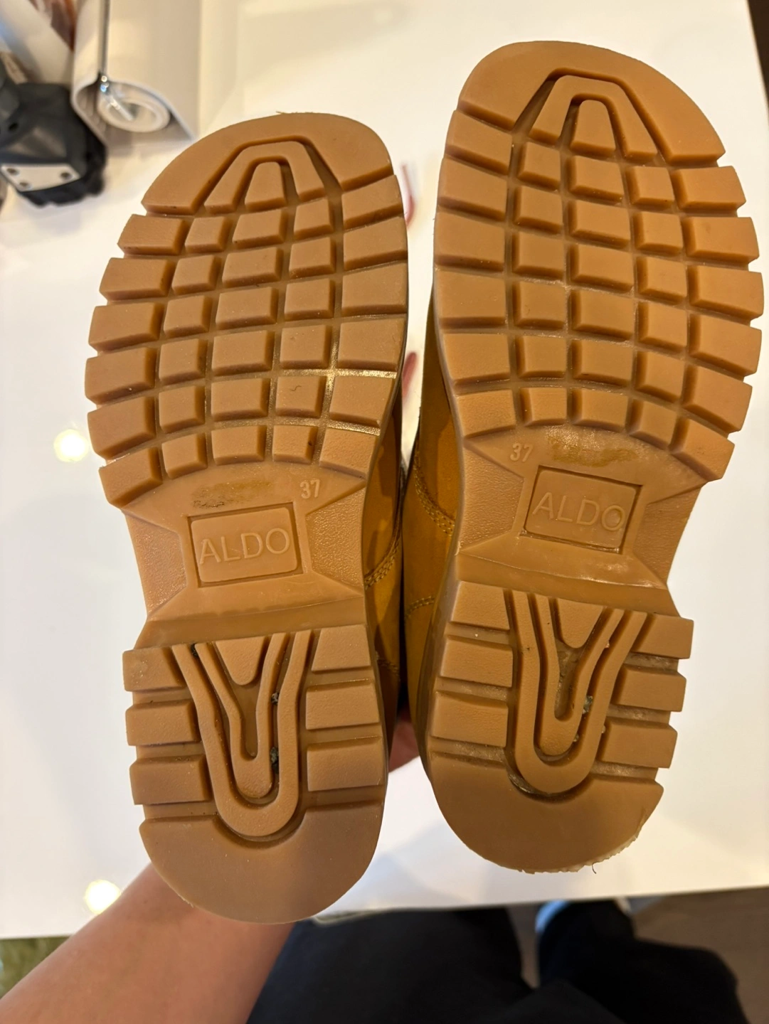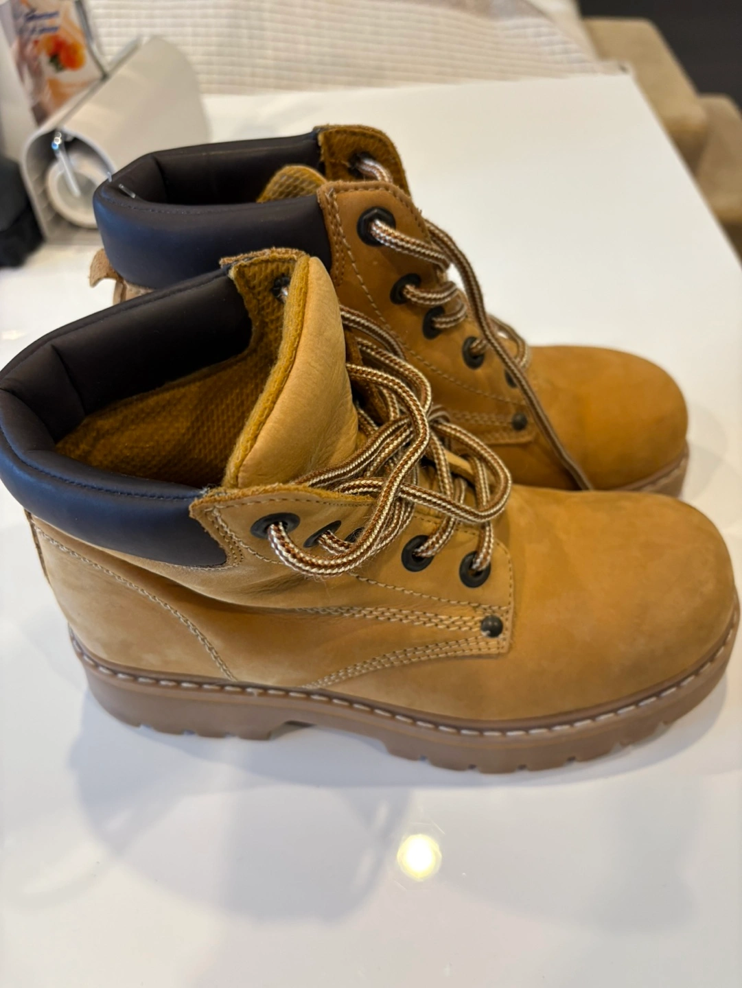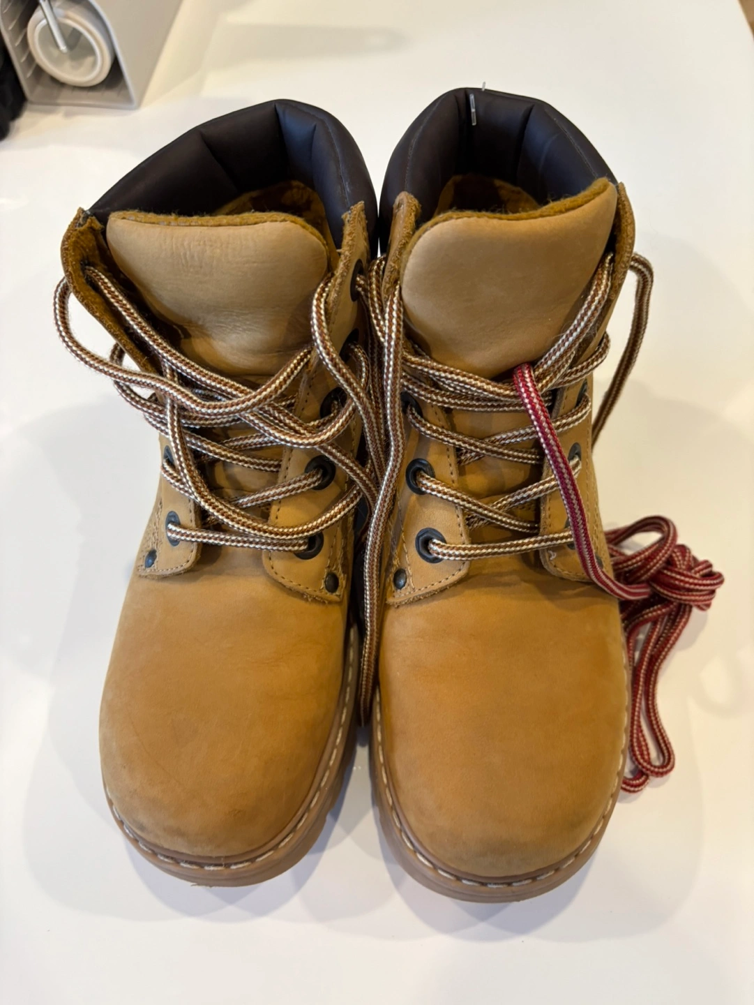 Women's tan leather boots. Lace-up closure. Size 37. Made in Romania. Comes in original box.