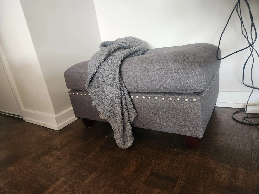 Grey fabric ottoman. Dark brown wooden legs. Nailhead trim. Perfect for extra seating. (Blanket not included)