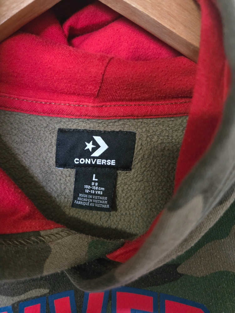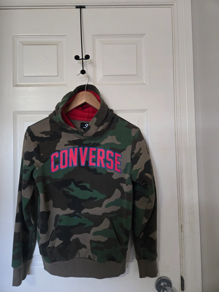 Youth large camouflage hoodie. Red interior hood. Front pouch pocket. Good condition.