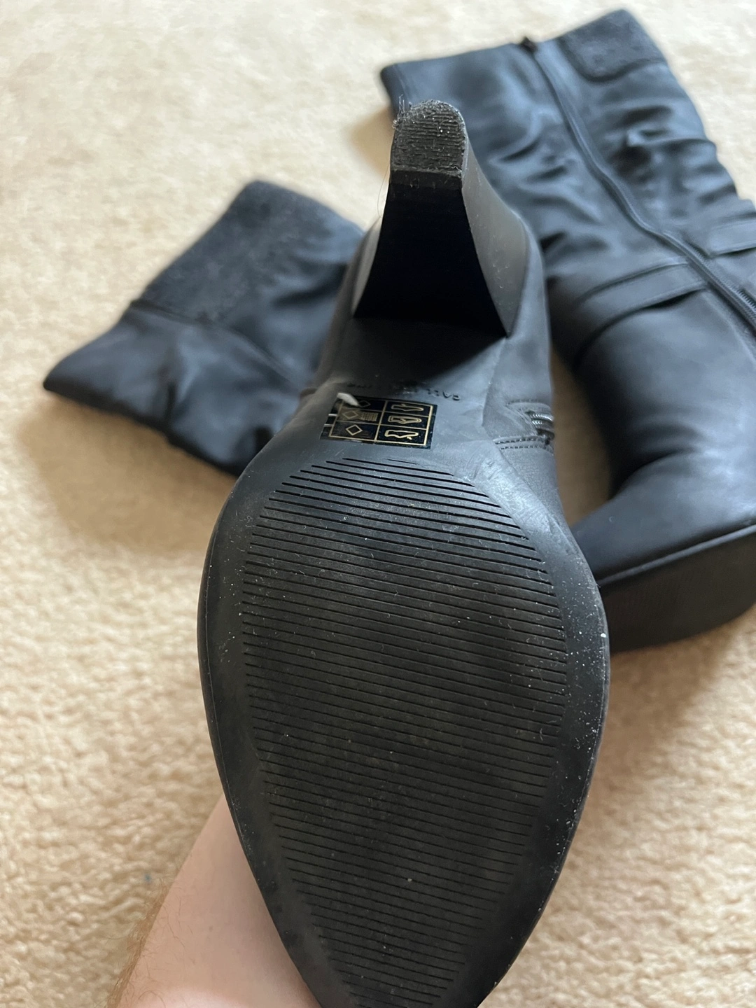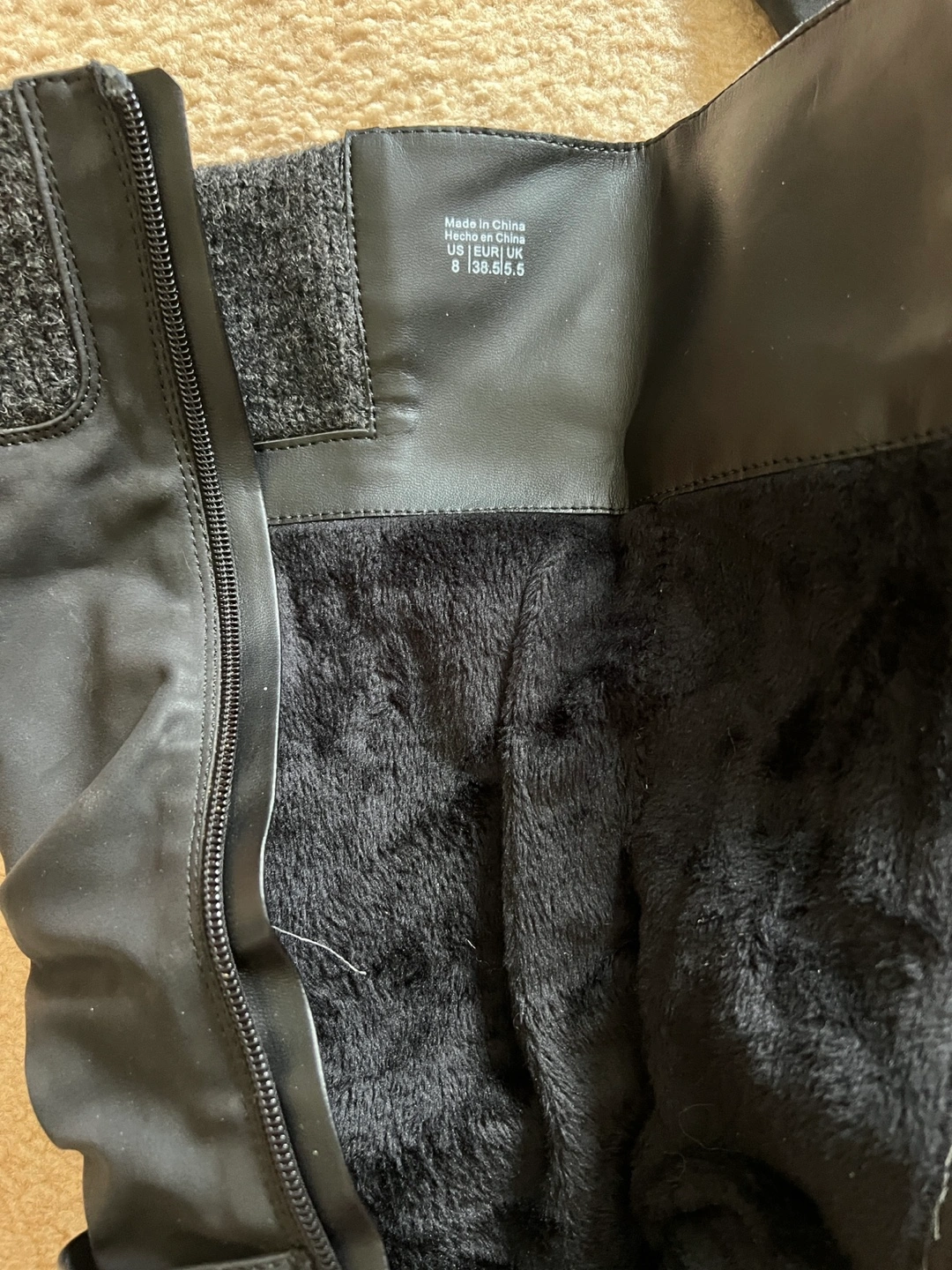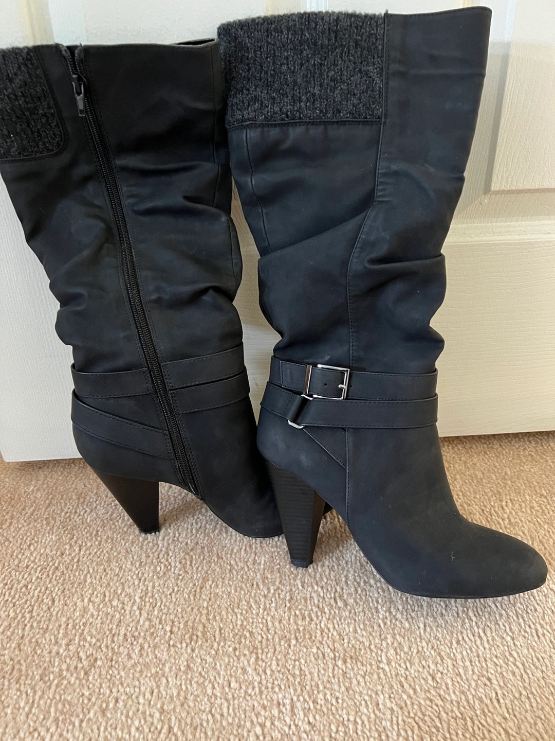 Black slouch boots with grey knit cuff.