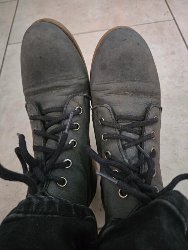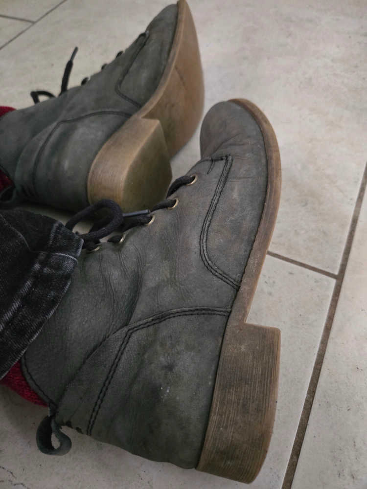Worn dark grey leather ankle boots. Lace-up closure. Rounded toe. Well-worn but still life left in them. Pick up in Kensington Market.
