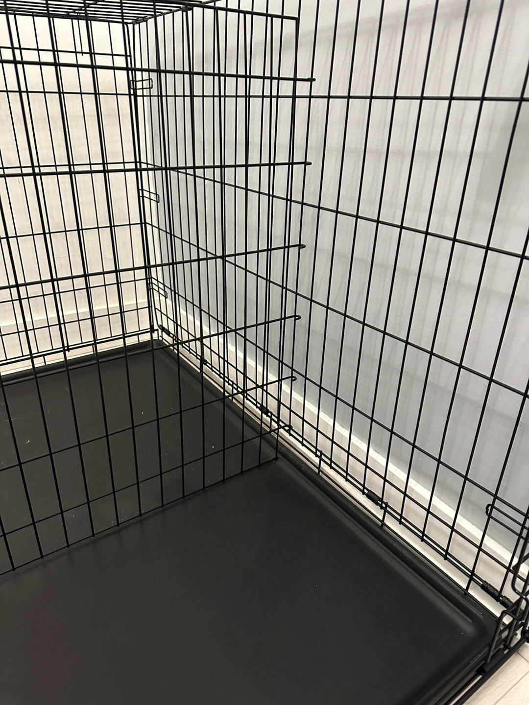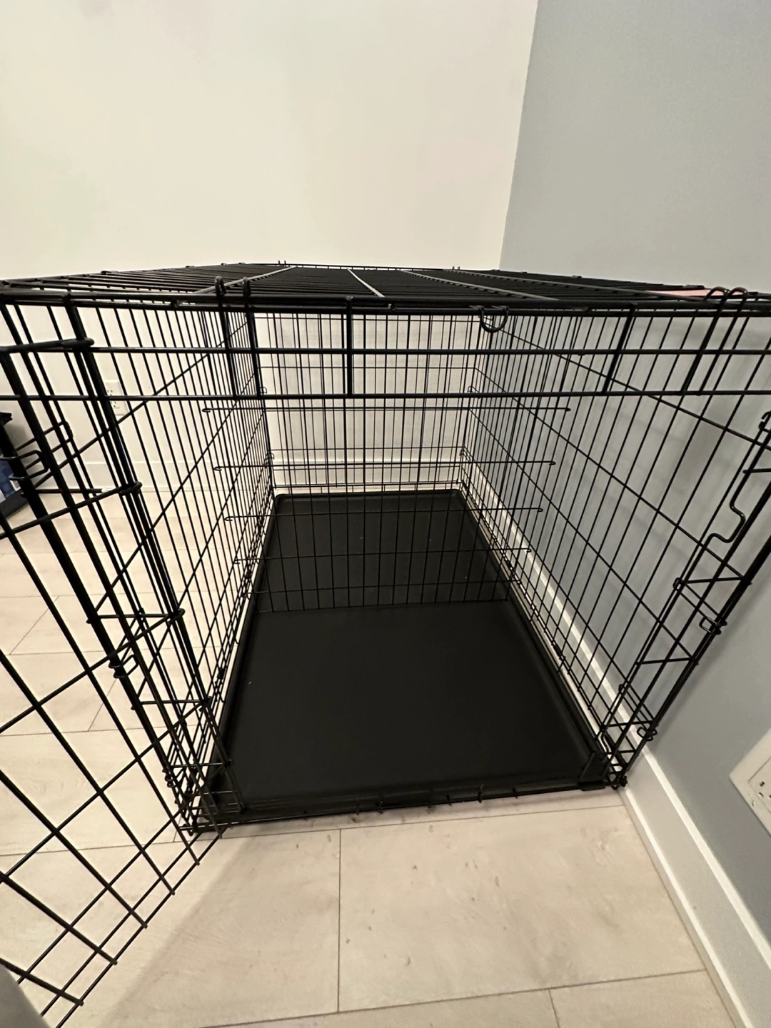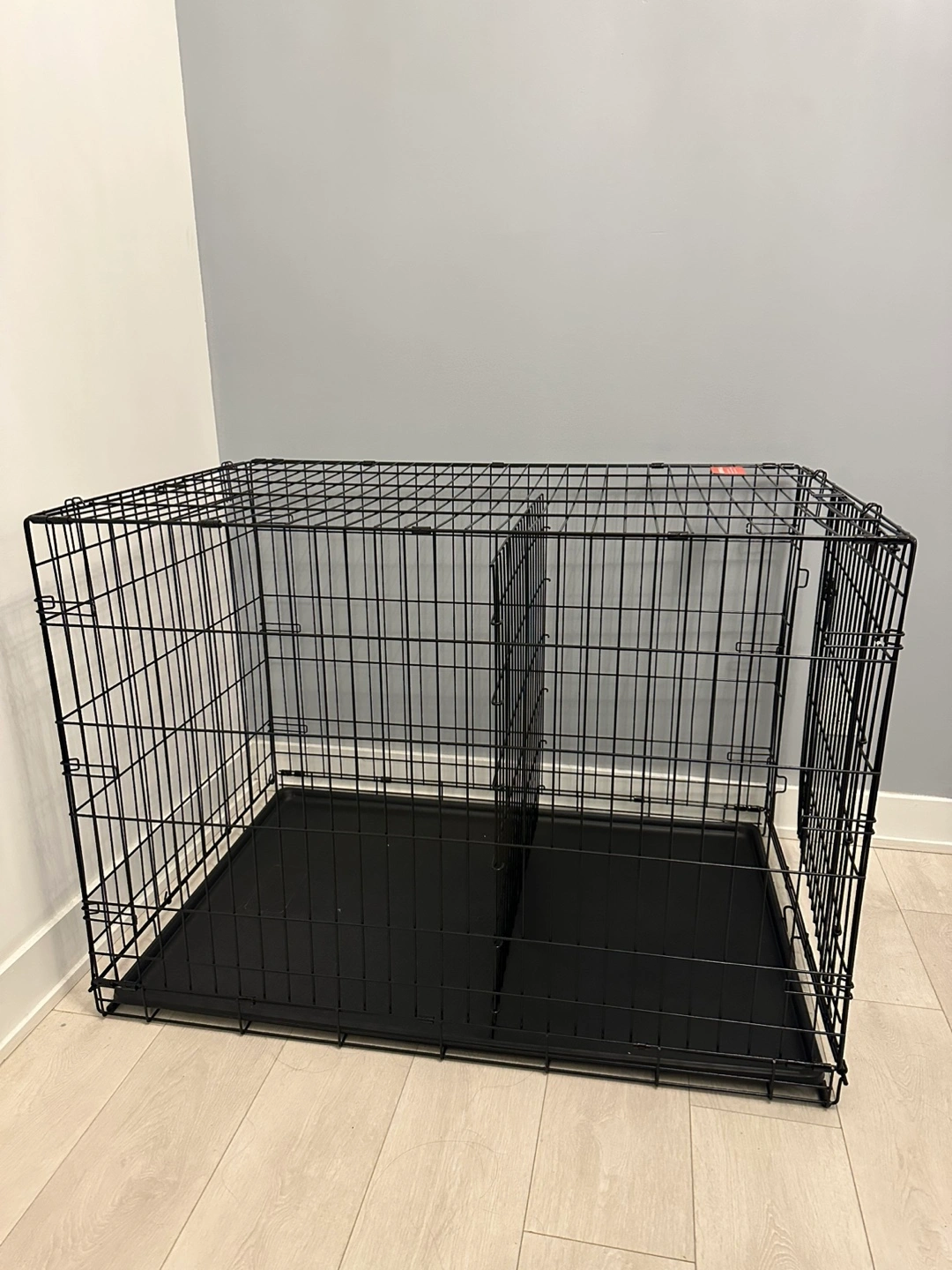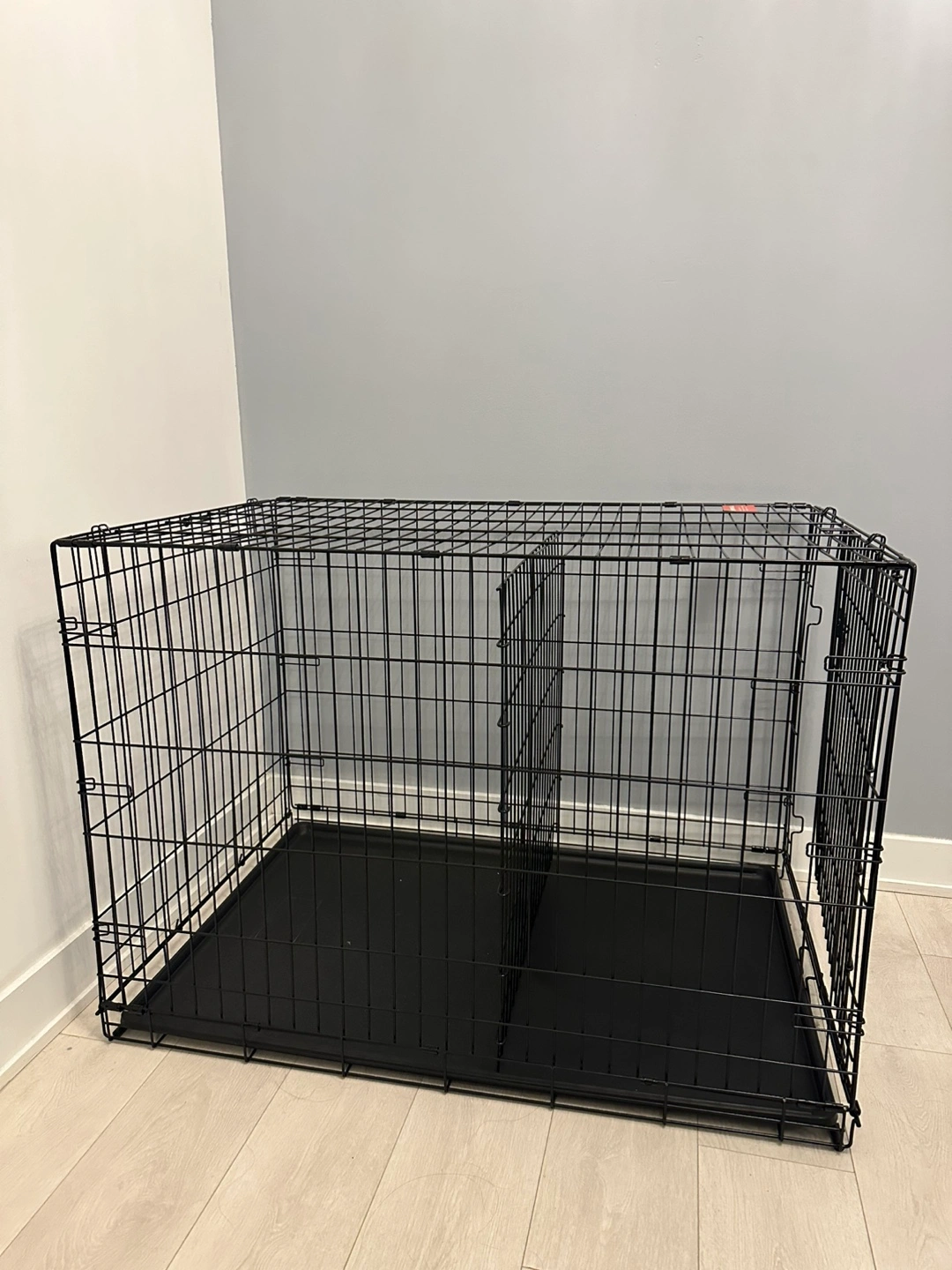 Spacious dog crate, black metal construction. Includes a removable plastic tray. Double door design. Easy to assemble and disassemble. Only used for a week, so basically brand new!