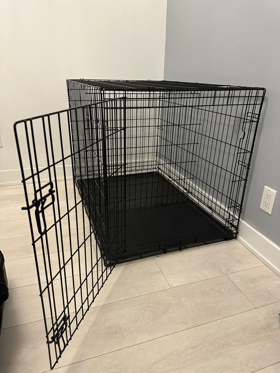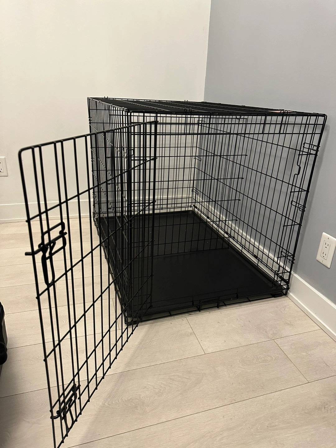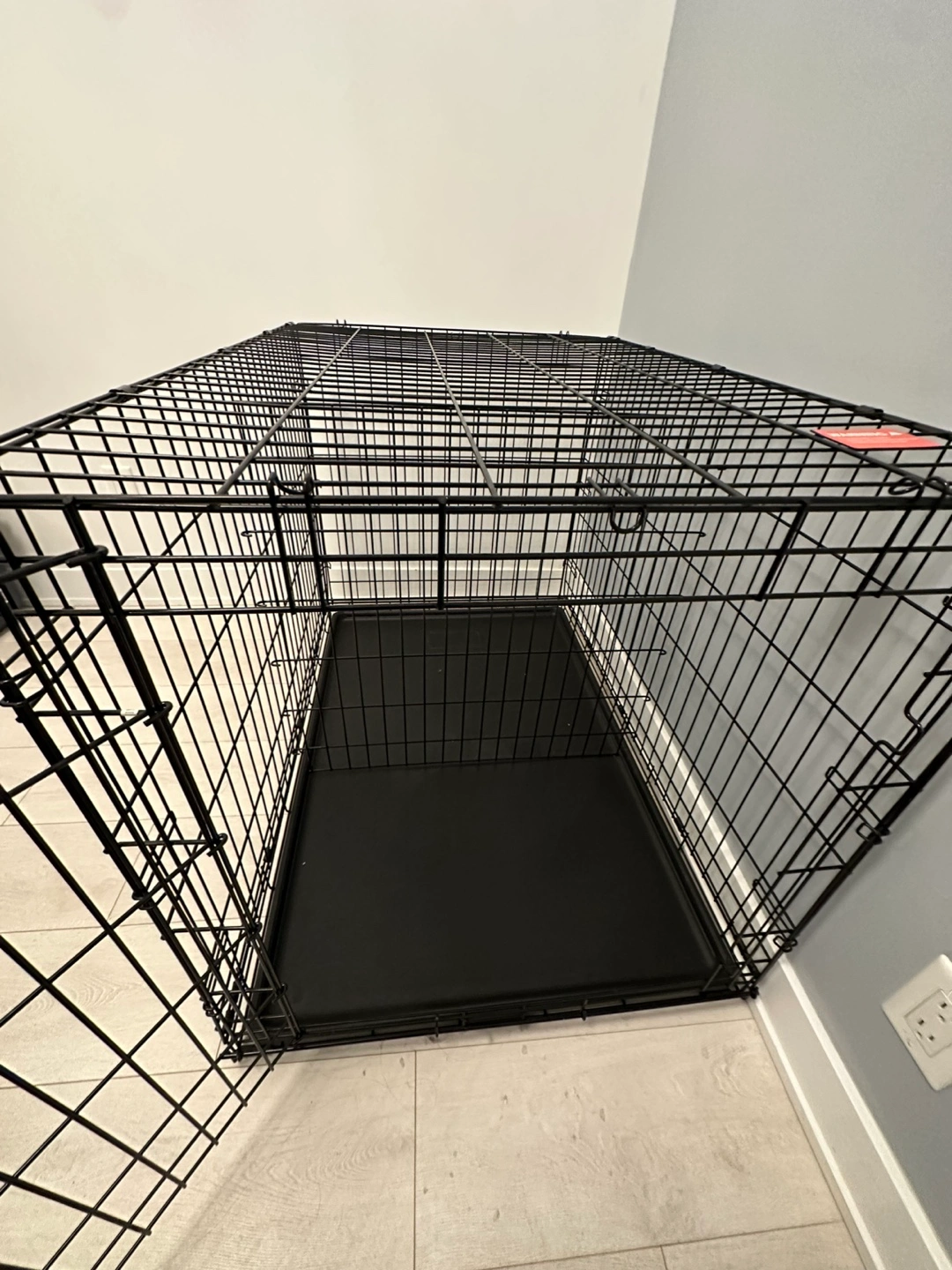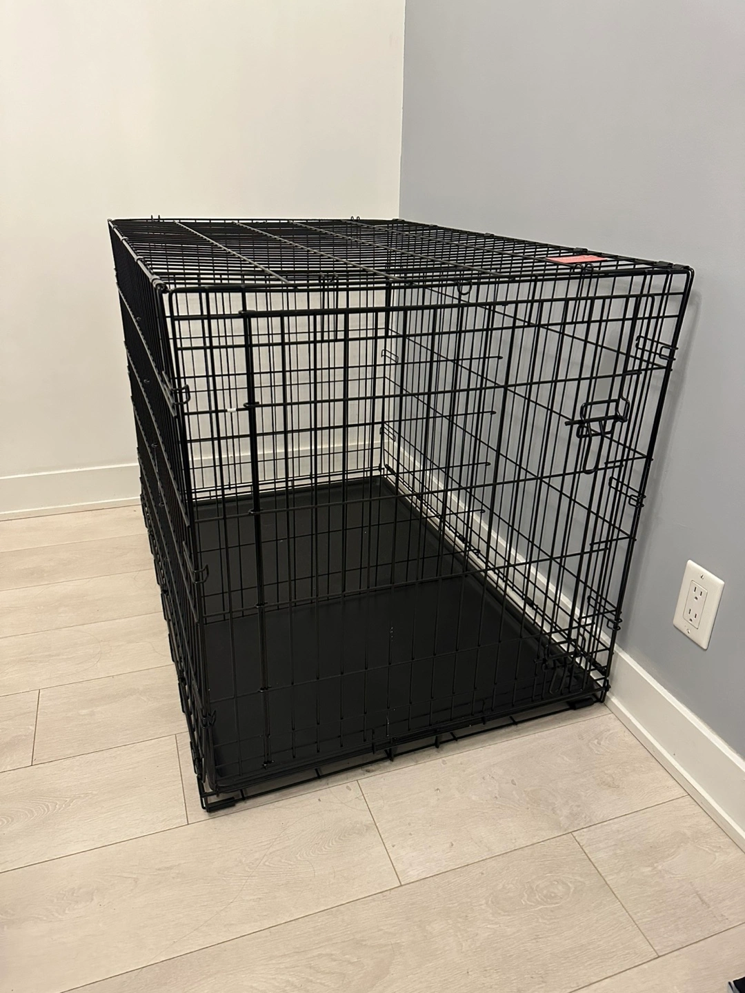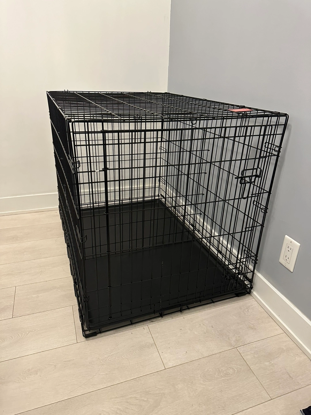 Spacious dog crate, black metal construction. Includes a removable plastic tray. Double door design. Easy to assemble and disassemble. Only used for a week, so basically brand new!