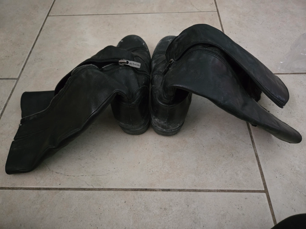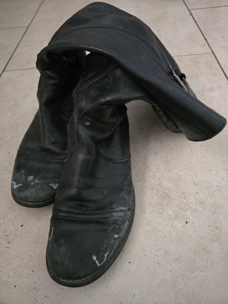 Pair of well-worn black near-knee-high boots. Side zippers. Shows significant wear. Good for everyday use or costume. One of the zippers is glitchy. Salt marks should come off pretty easily with some TLC. Priority to quickest pick up in Kensington Market.