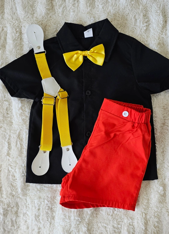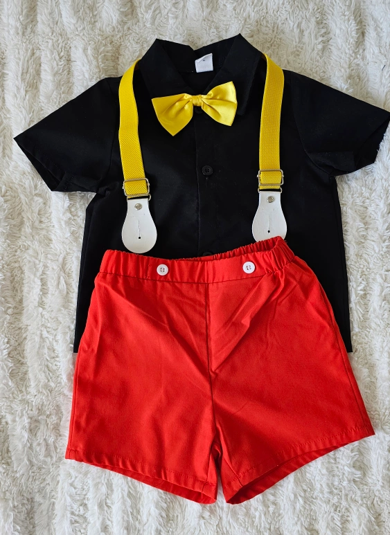 Cute Mickey Mouse-inspired outfit. Black shirt, red shorts, and yellow bowtie/suspenders. Perfect for a special occasion, photos or Disney outfit. 18-24 months