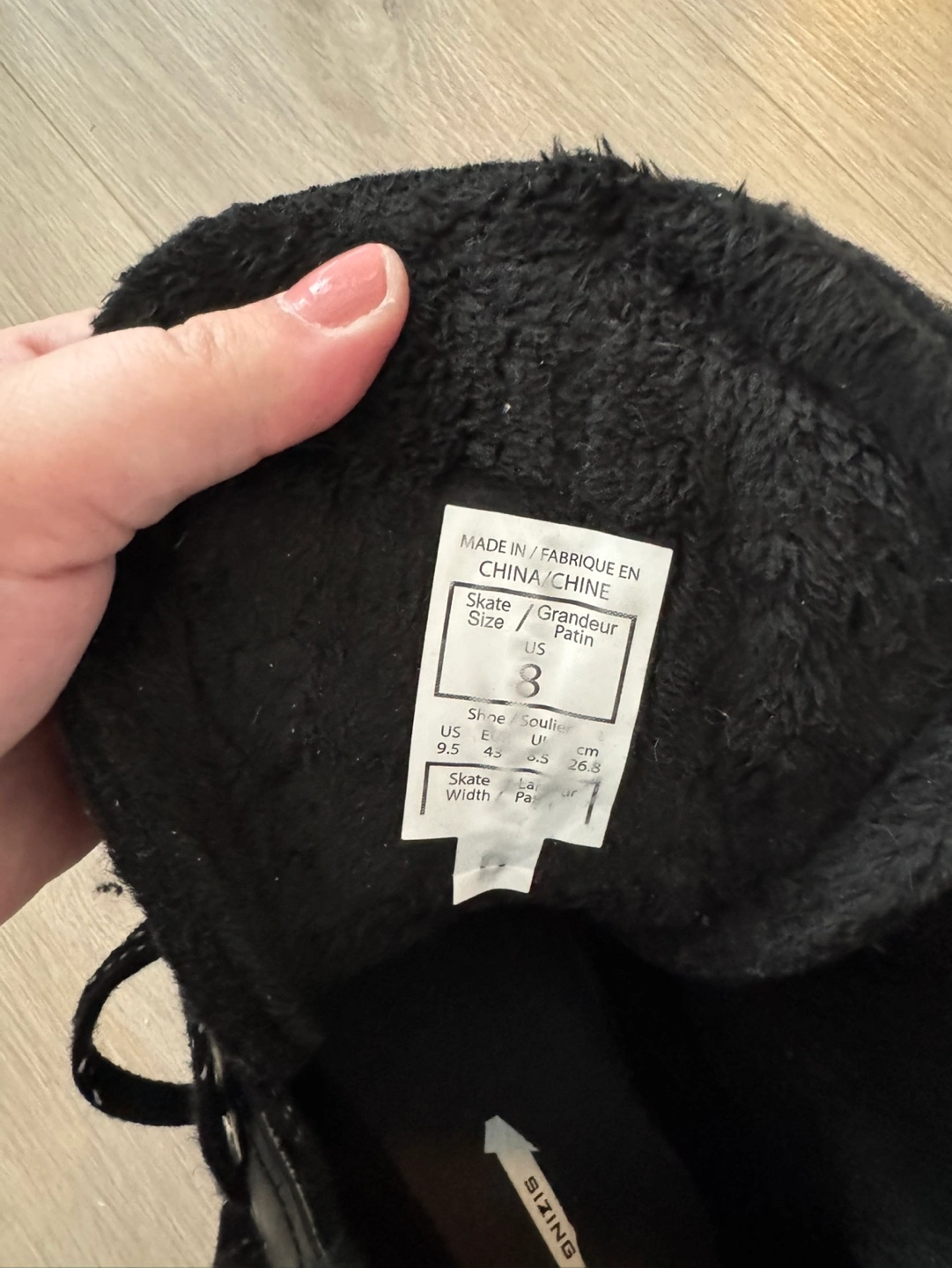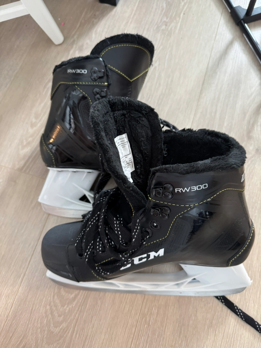CCM RW300 youth hockey skates. Size US 8. Black with yellow accents. Lace-up closure.