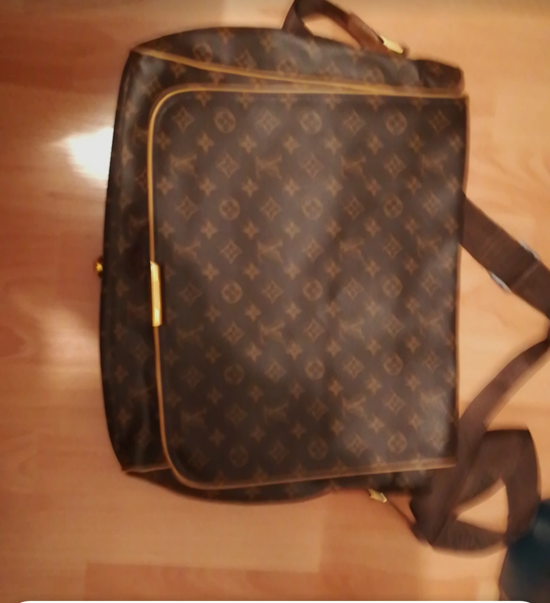 Brown monogram canvas messenger bag. Adjustable shoulder strap. Gold-toned hardware. Classic style.
