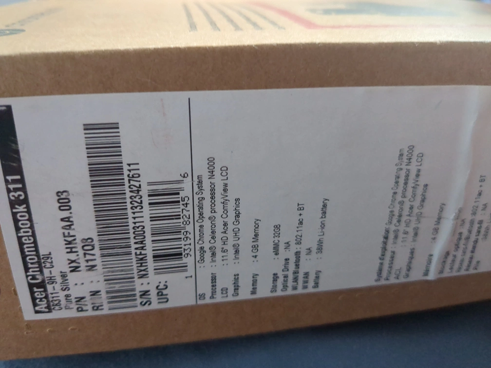 New Acer Chromebook 311 in Pure Silver. Chrome OS operating system. Intel Celeron processor. 4 GB memory. 32 GB storage. 11.6 inch HD display. Includes battery.