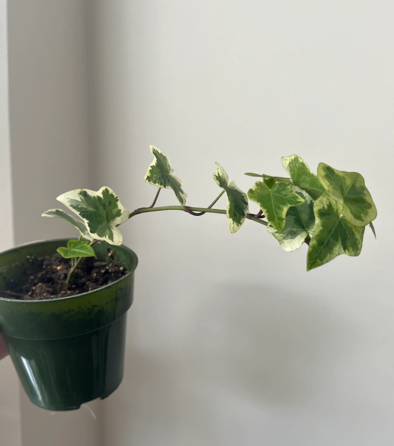 223Healthy potted English ivy. Small plant, perfect for a desk or shelf. Green and white variegated leaves. Growing vine.