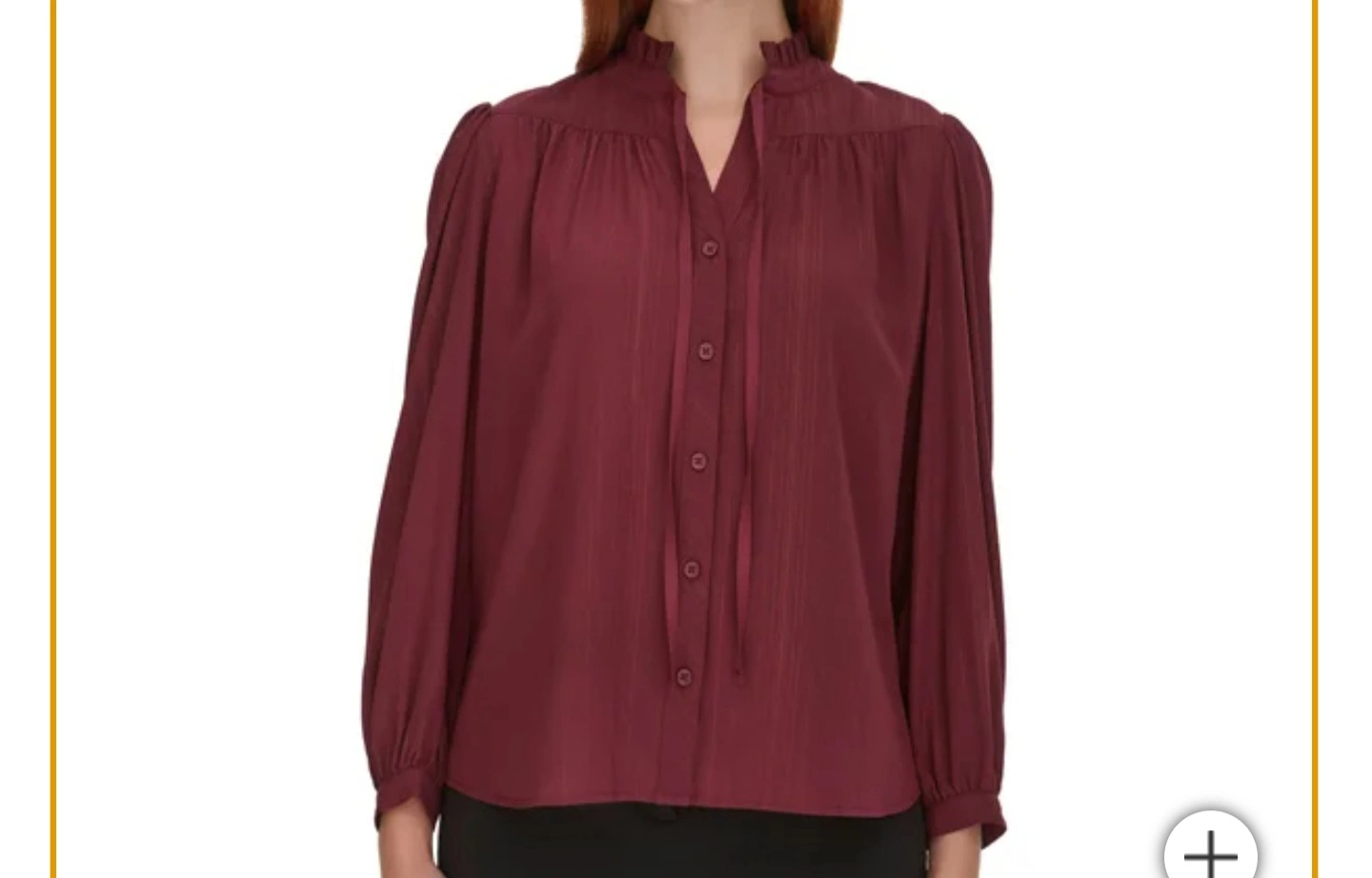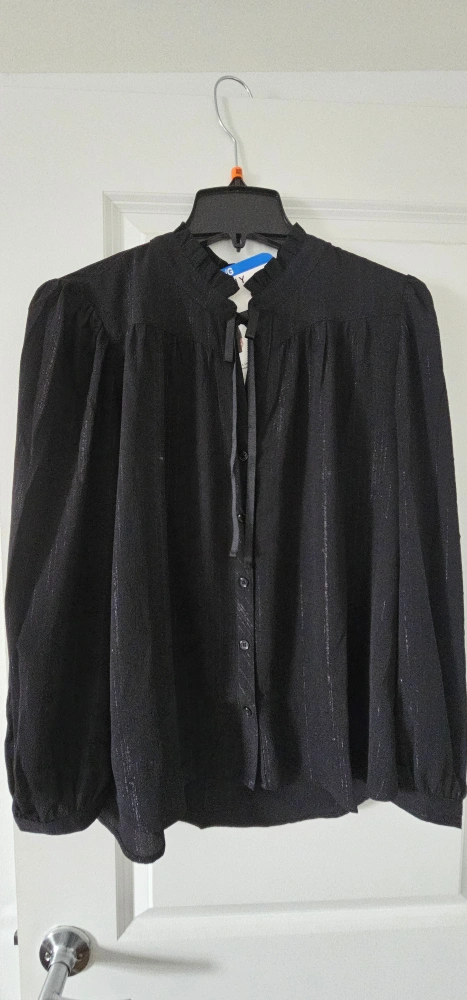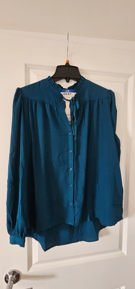 Beautiful DKNY women's blouse. Long sleeves, button front, tie neck detail. Available in teal, burgundy, and black. Slight sheen to the fabric. Size and material details on tag.