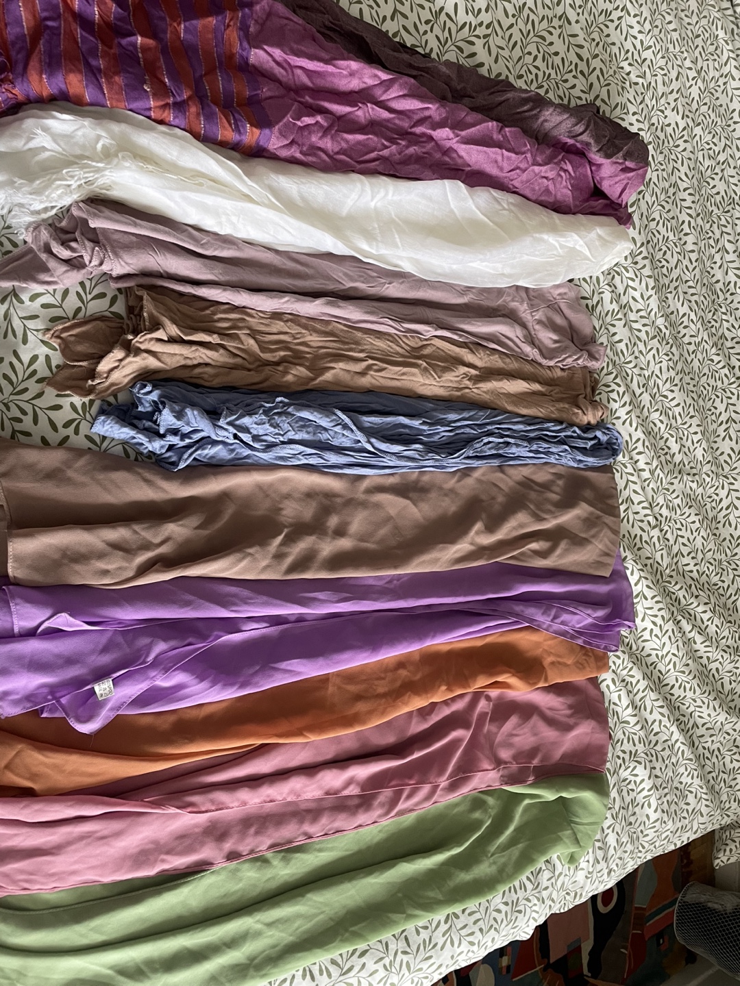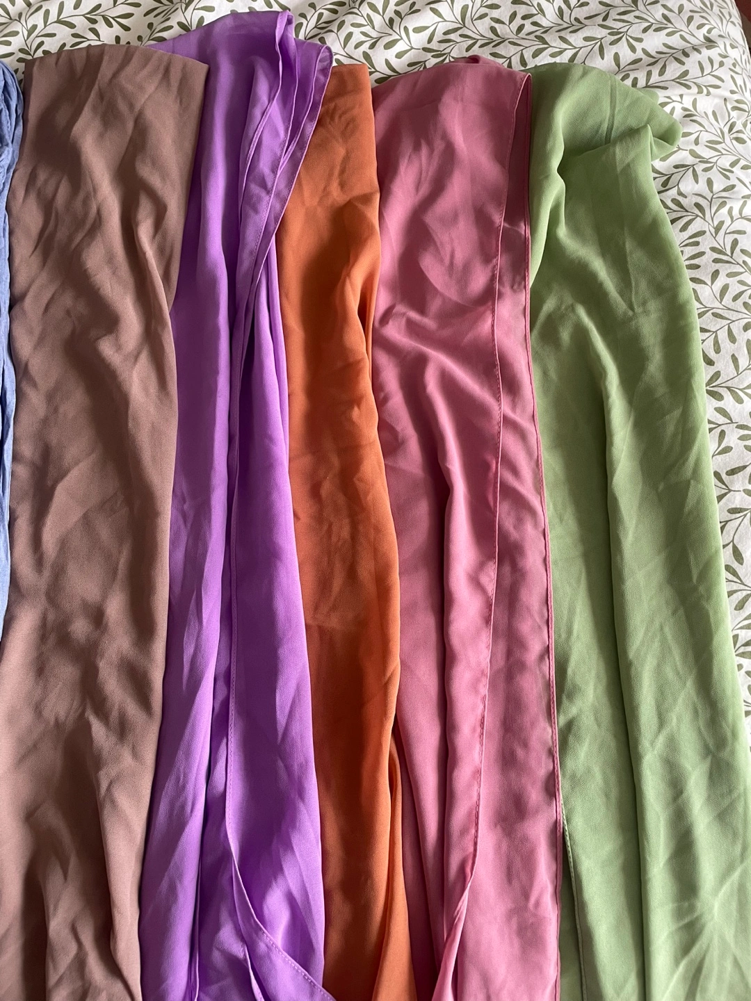 Ten Hijabs in various colours and fabrics. Includes solid colours and patterned. If you don ’t like all of them, take them and share it with other Muslims sister please!