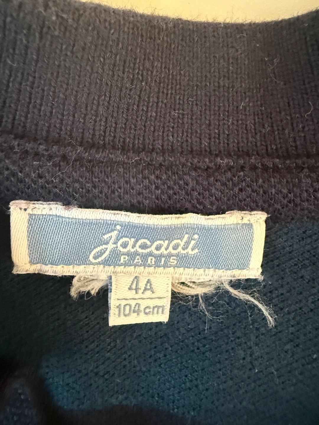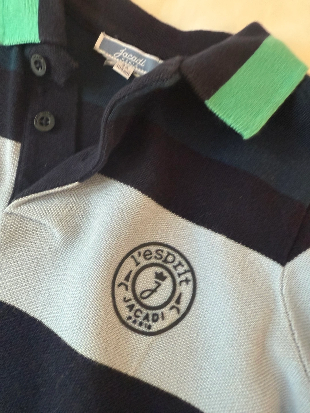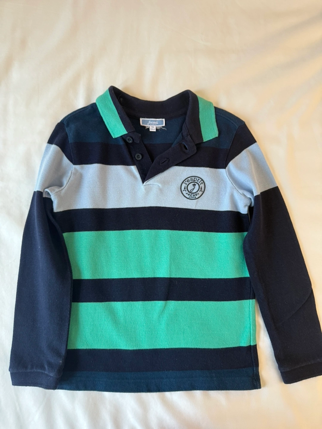 Jacadi Paris boys' long-sleeve polo shirt. Size 4A (104cm). Striped design in navy, light blue, and mint green. Features a button placket and brand logo. Pre-owned.