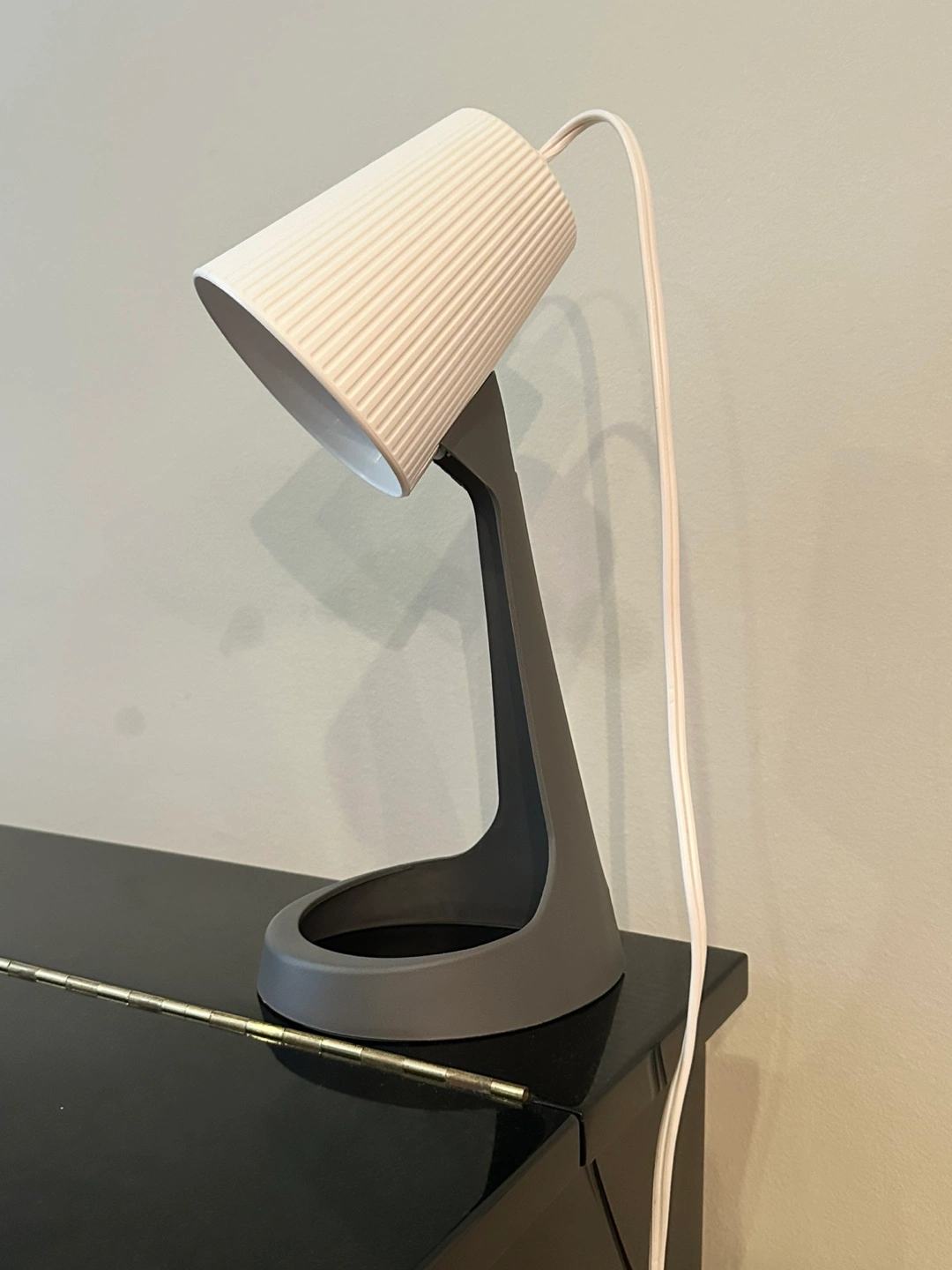 123Stylish and compact desk lamp. Features a ribbed off-white shade and dark grey base. Simple design, perfect for a minimalist aesthetic. Cord included.