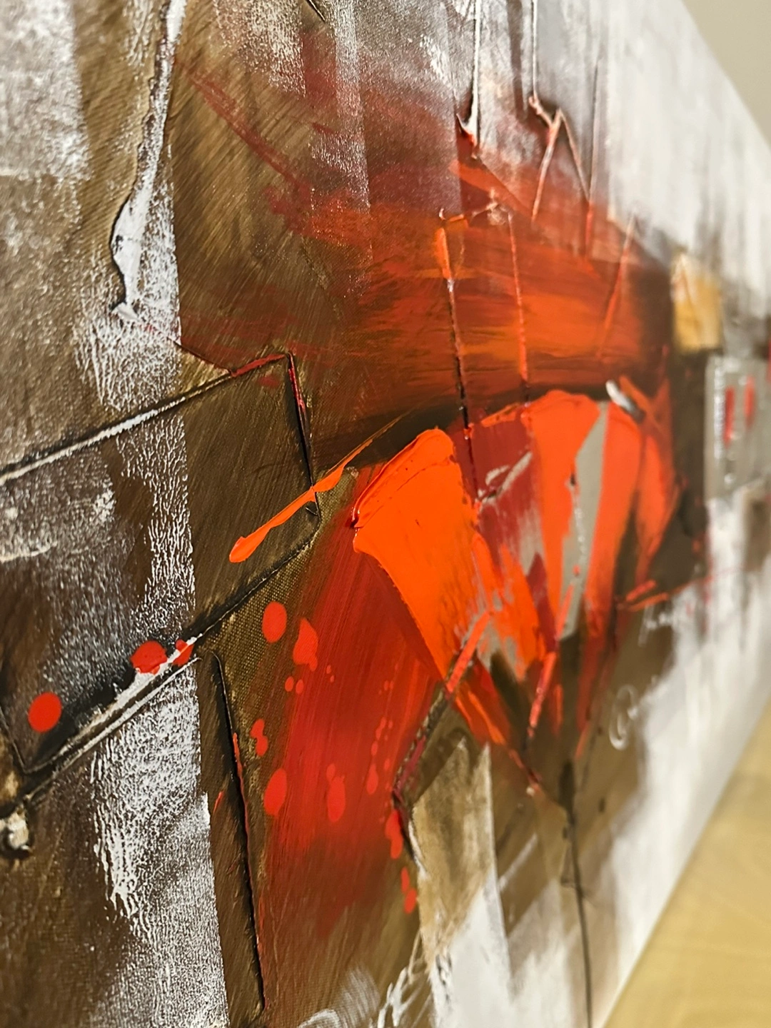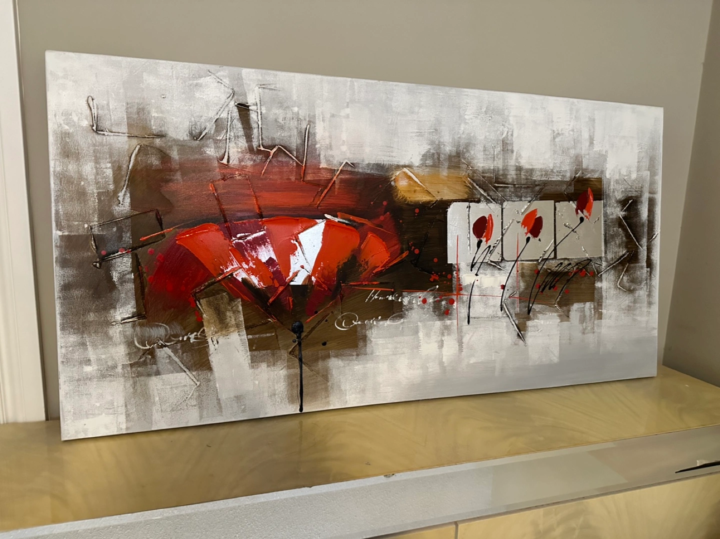 123Stunning large abstract canvas painting. Red, brown, and white colours. Thick brushstrokes. Modern art. Great statement piece for your home. Dimensions: 55” W x 28” H