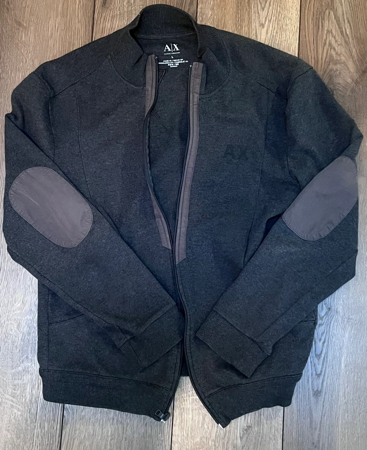 Grey zip-up bomber jacket. Features elbow patches. AX logo on the front and back. Great condition.
