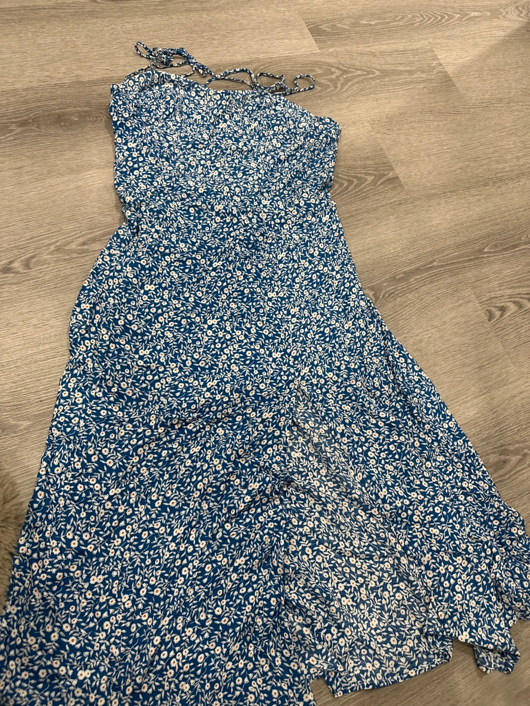 Beautiful blue floral midi dress. Features thin straps that tie at the back and a front slit. Lightweight and flowy fabric. Perfect for summer. *cash only*
