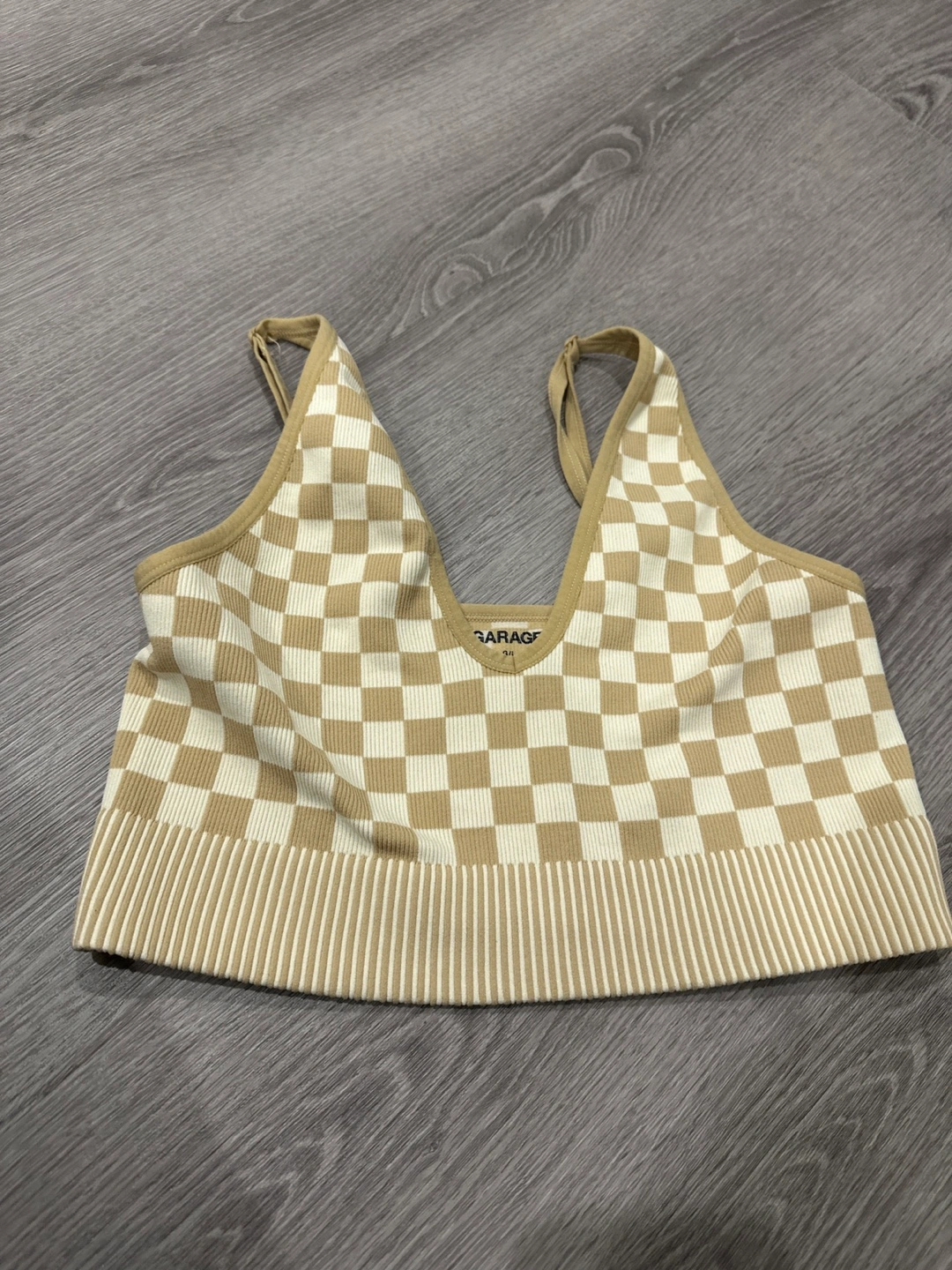 Cute beige and white checkered knit crop top. Features a V-neck and adjustable thin straps. Great for layering or wearing on its own. *cash only*