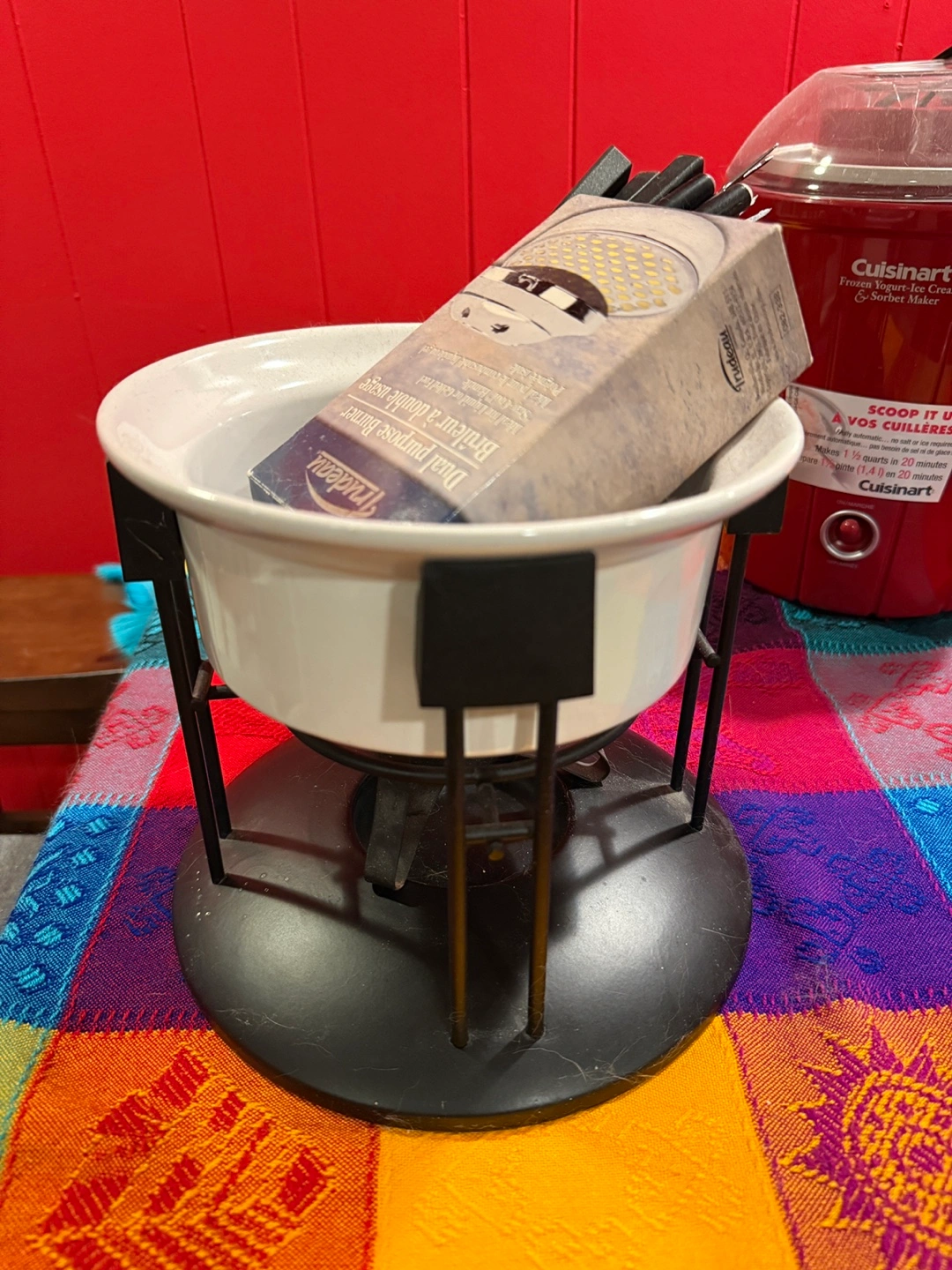 286White ceramic fondue pot, black metal stand. Includes box of Trudeau dual purpose burner. #freecycle