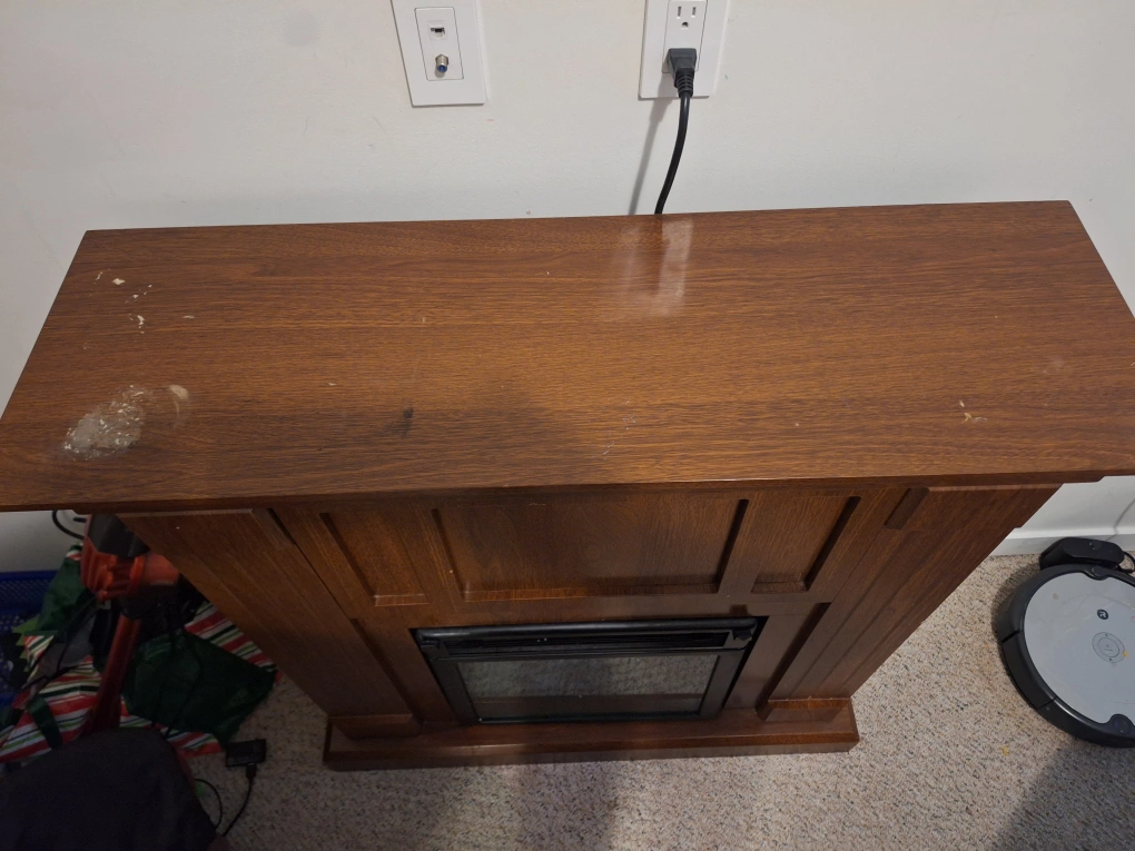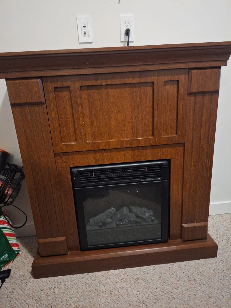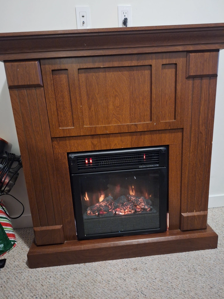 Electric fireplace with wooden mantel in working condition. Features realistic flame effect. Fair condition with visible wear and tear. Includes power cord. Needs some love to bring it back to original condition :).
