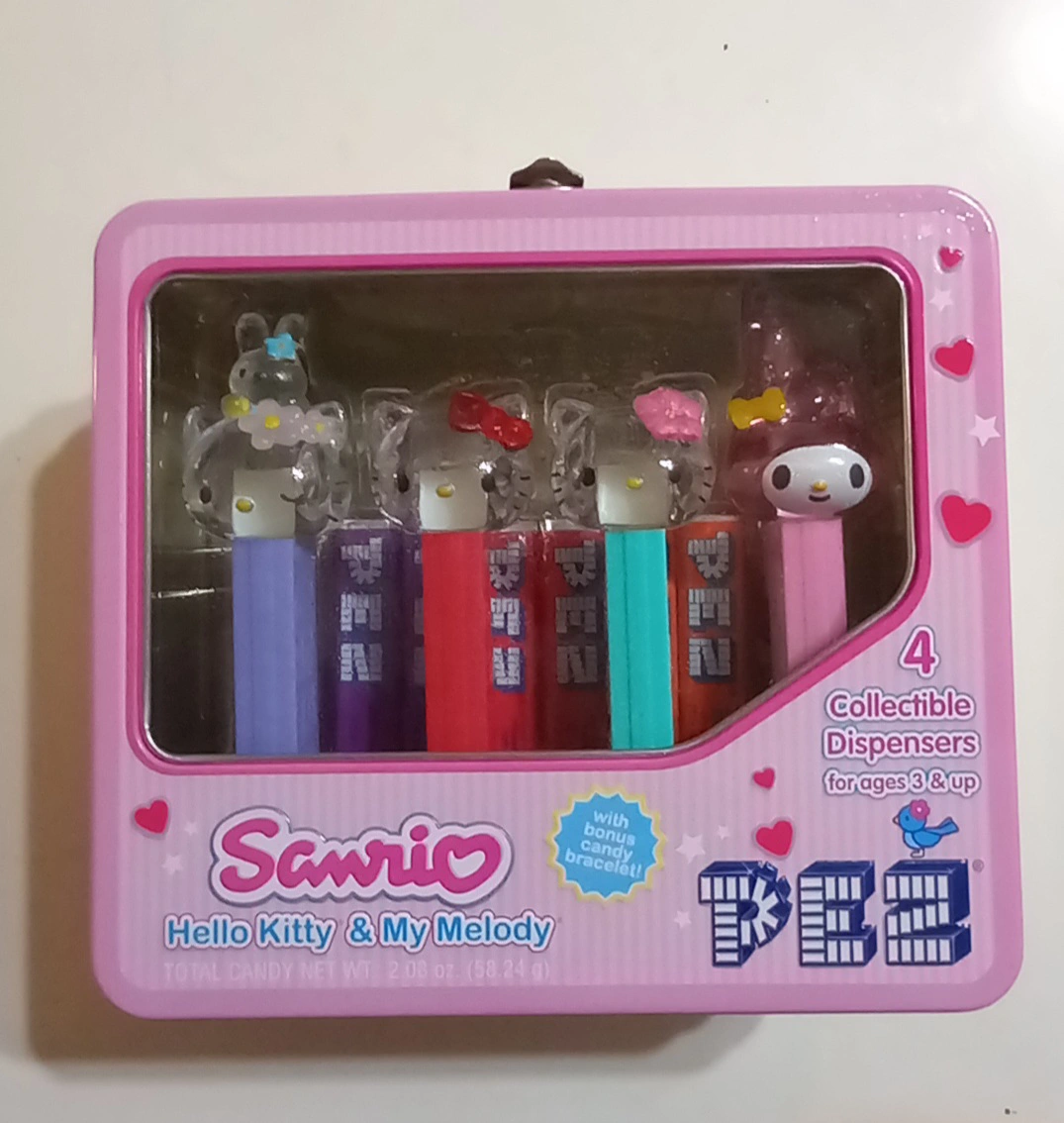 294 Crystal headed Pez set, Hello Kitty and My Melody characters, unopened in sealed tin box, dated 2006, has bonus candy bracelet and 6 packs of candy.