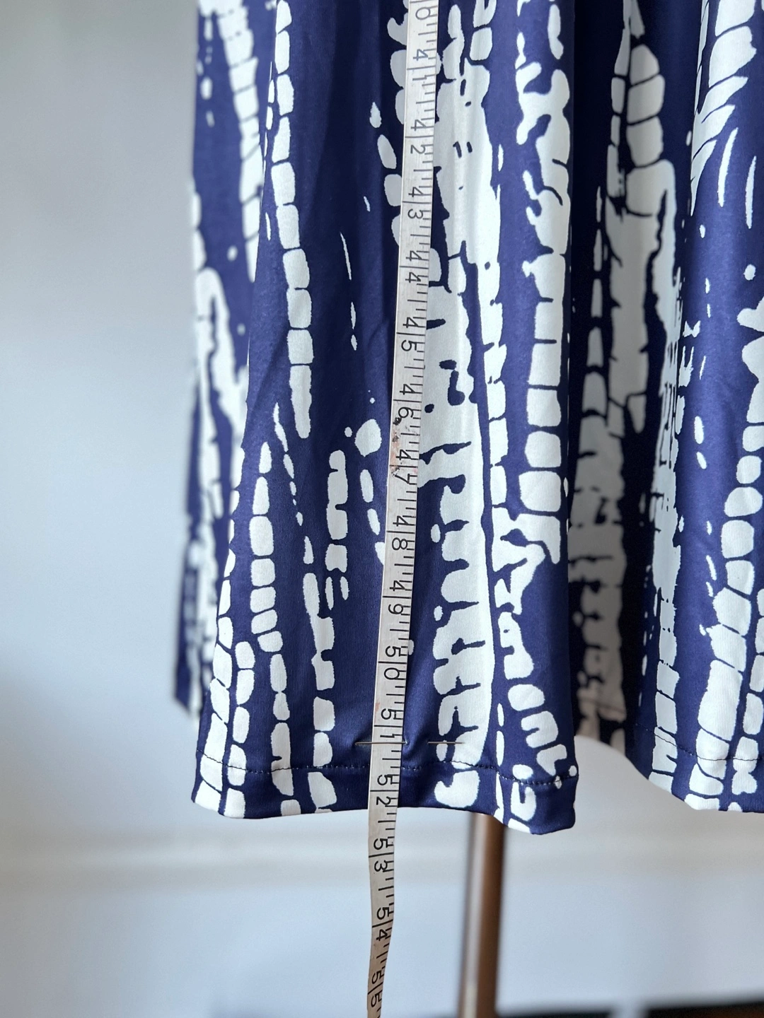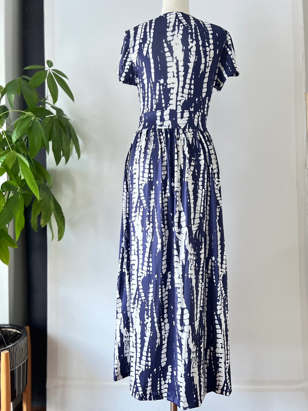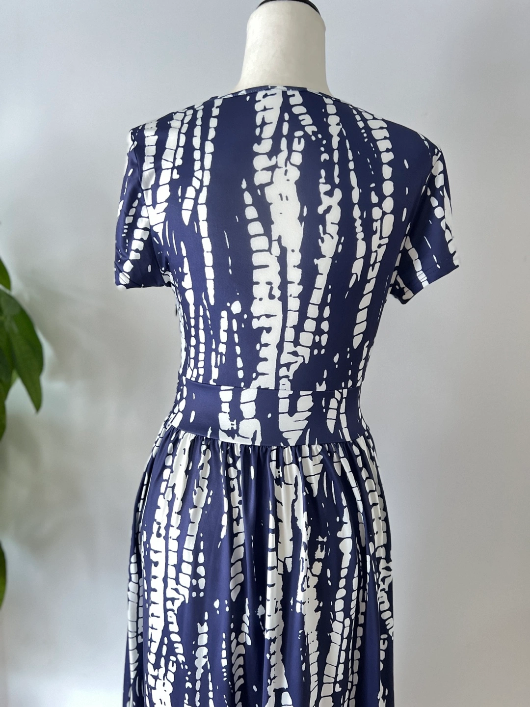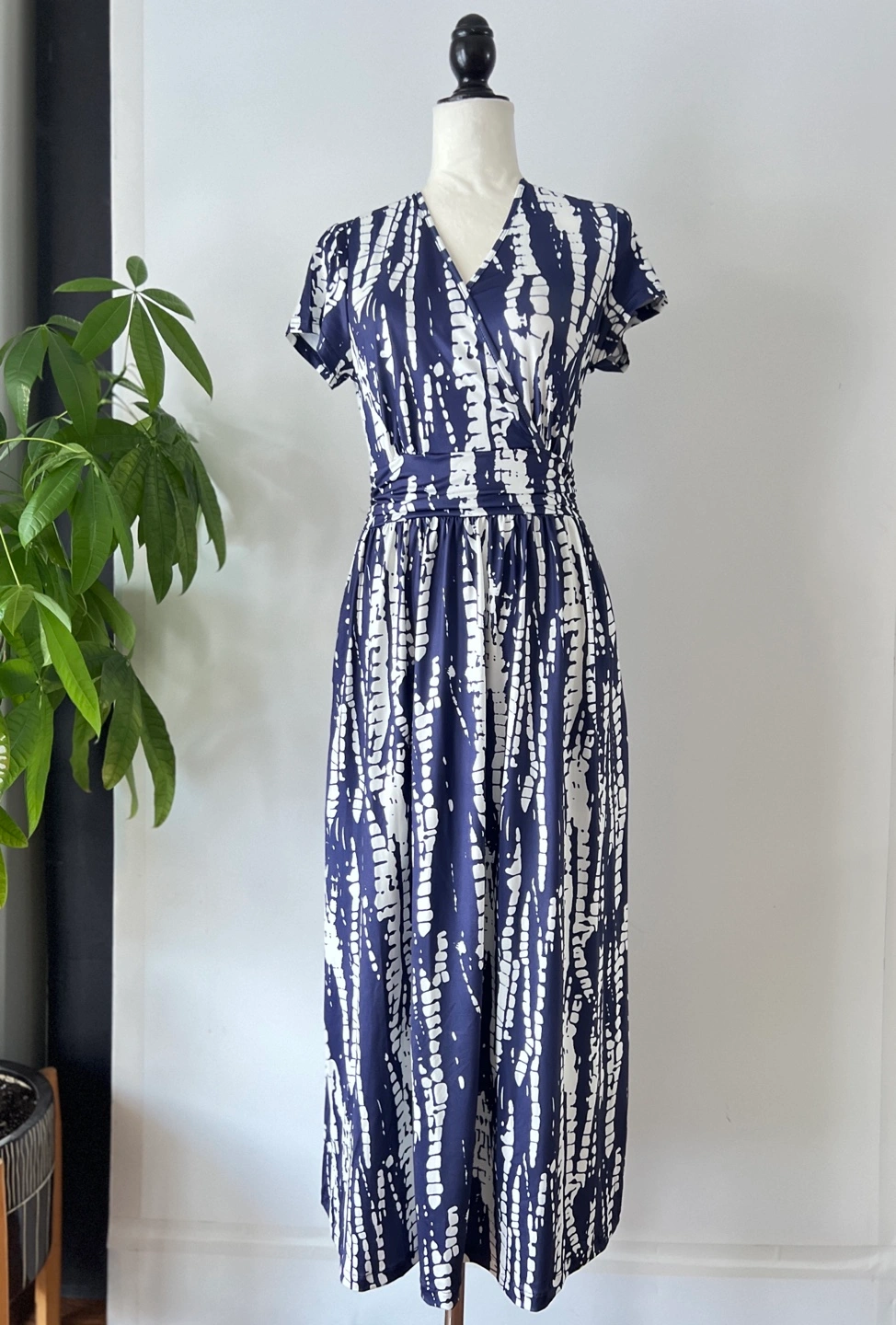 Stunning navy and white, soft, silky and super comfortable dress. Features short sleeves, a v-neck, and a flattering wrap-style bodice. Side pockets.!! Zipper on the side. Flowy skirt. Love this dress!