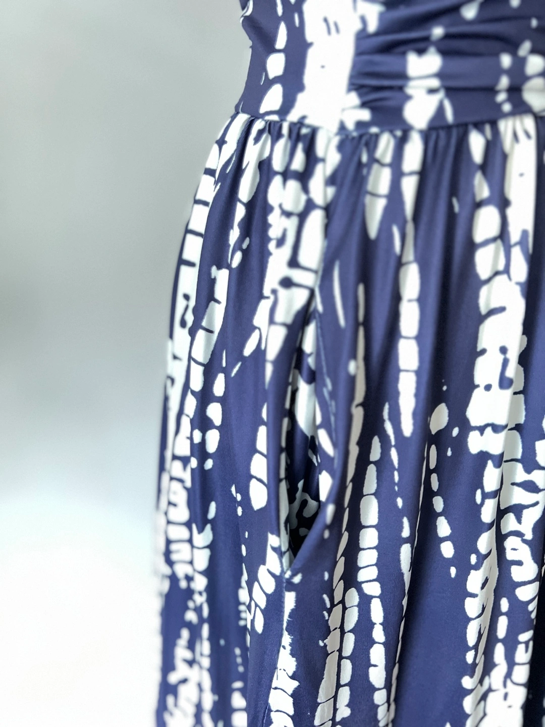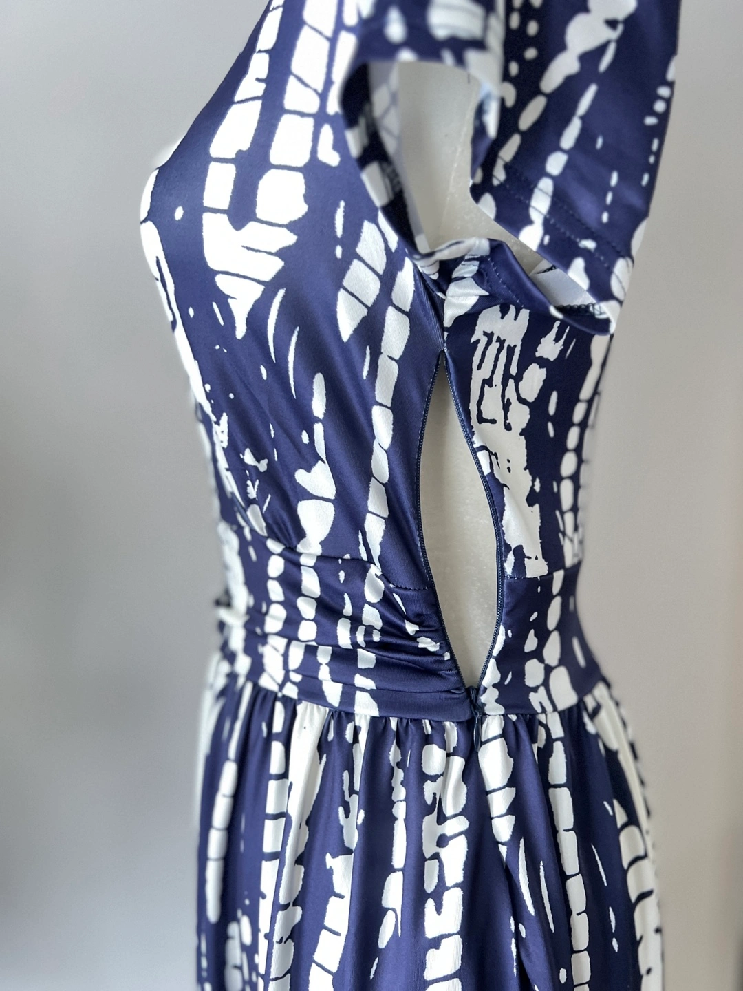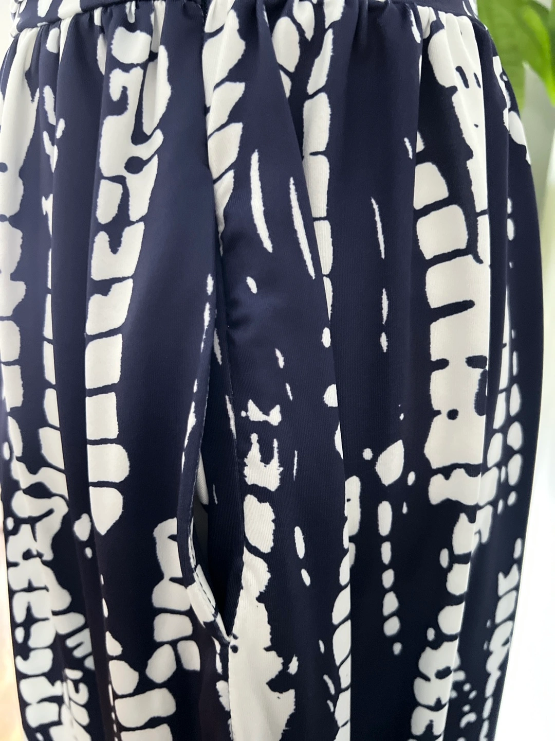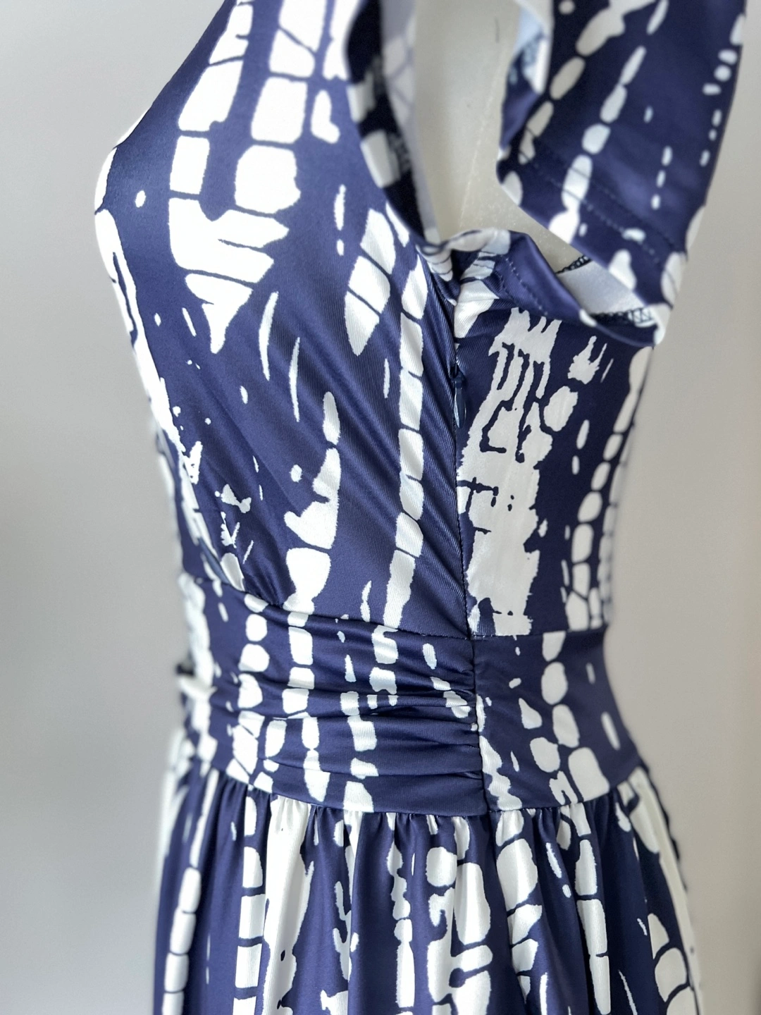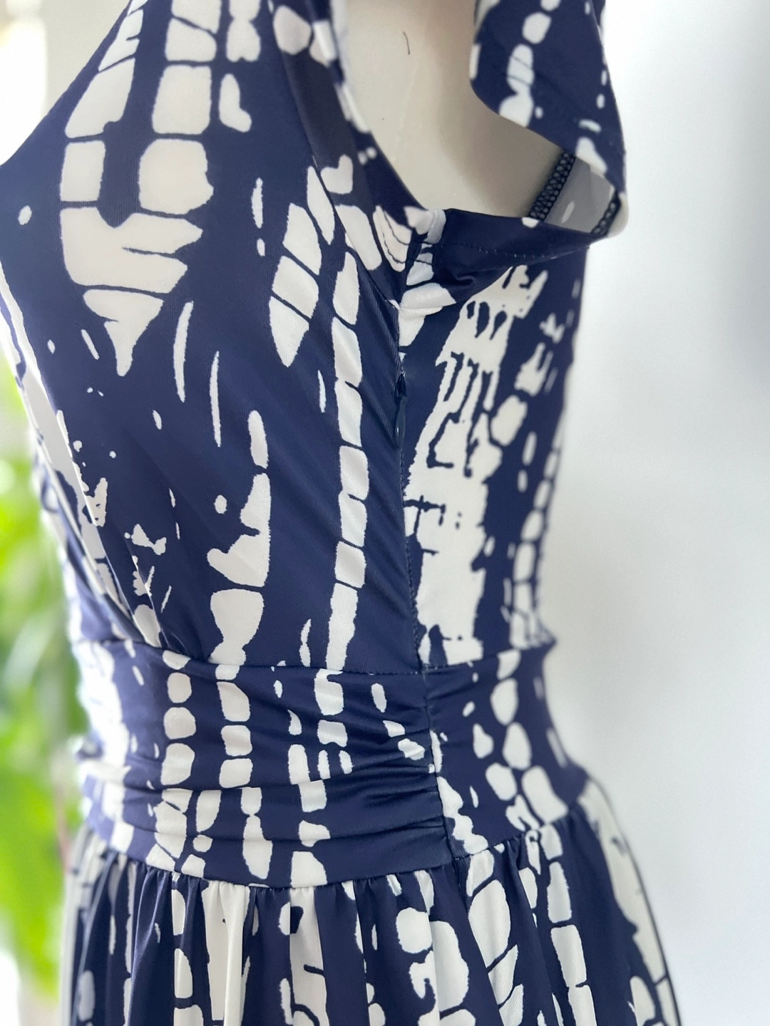 Stunning navy and white, soft, silky and super comfortable dress. Features short sleeves, a v-neck, and a flattering wrap-style bodice. Side pockets.!! Zipper on the side. Flowy skirt. Love this dress!