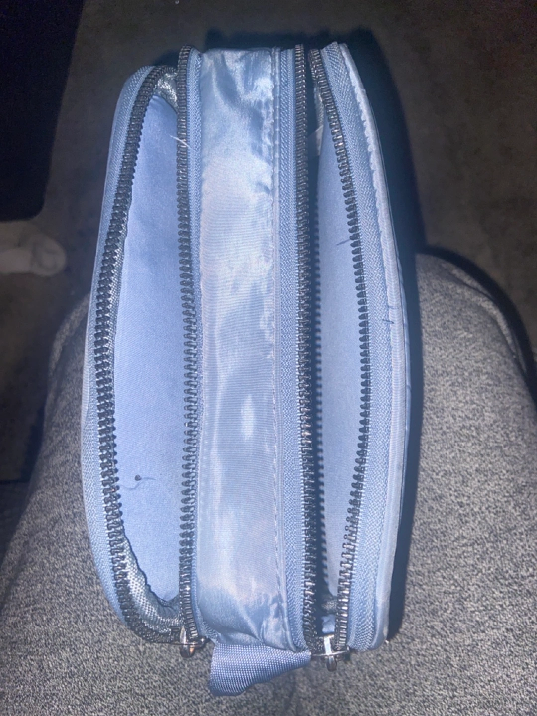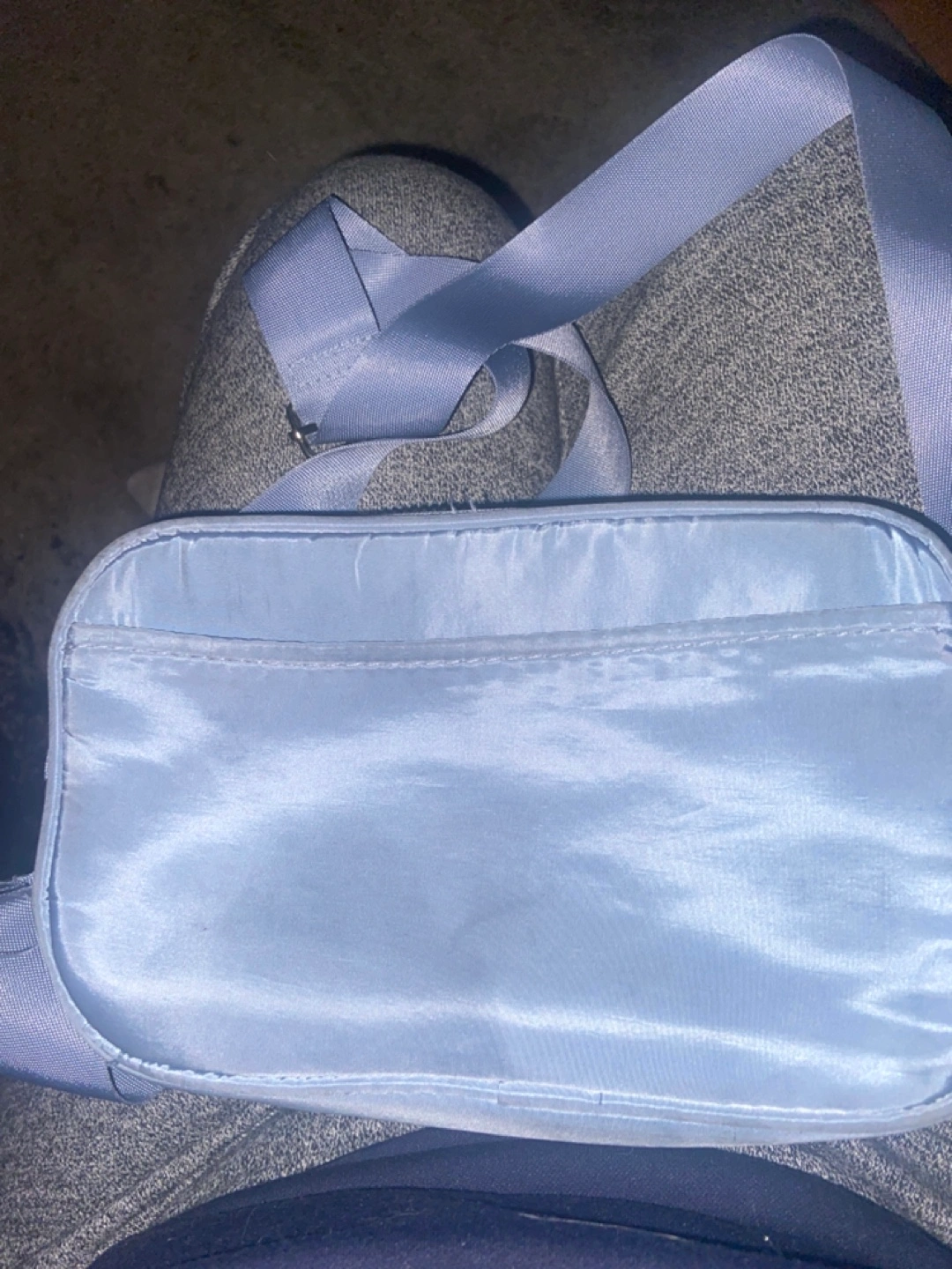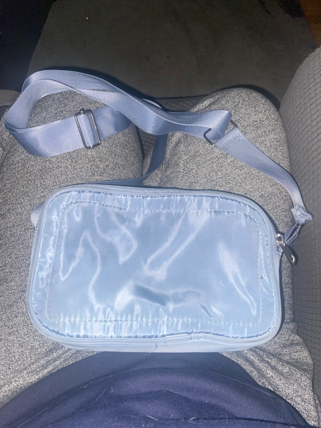 517Small light blue crossbody bag. Features an adjustable strap and two zippered compartments. Durable nylon material.