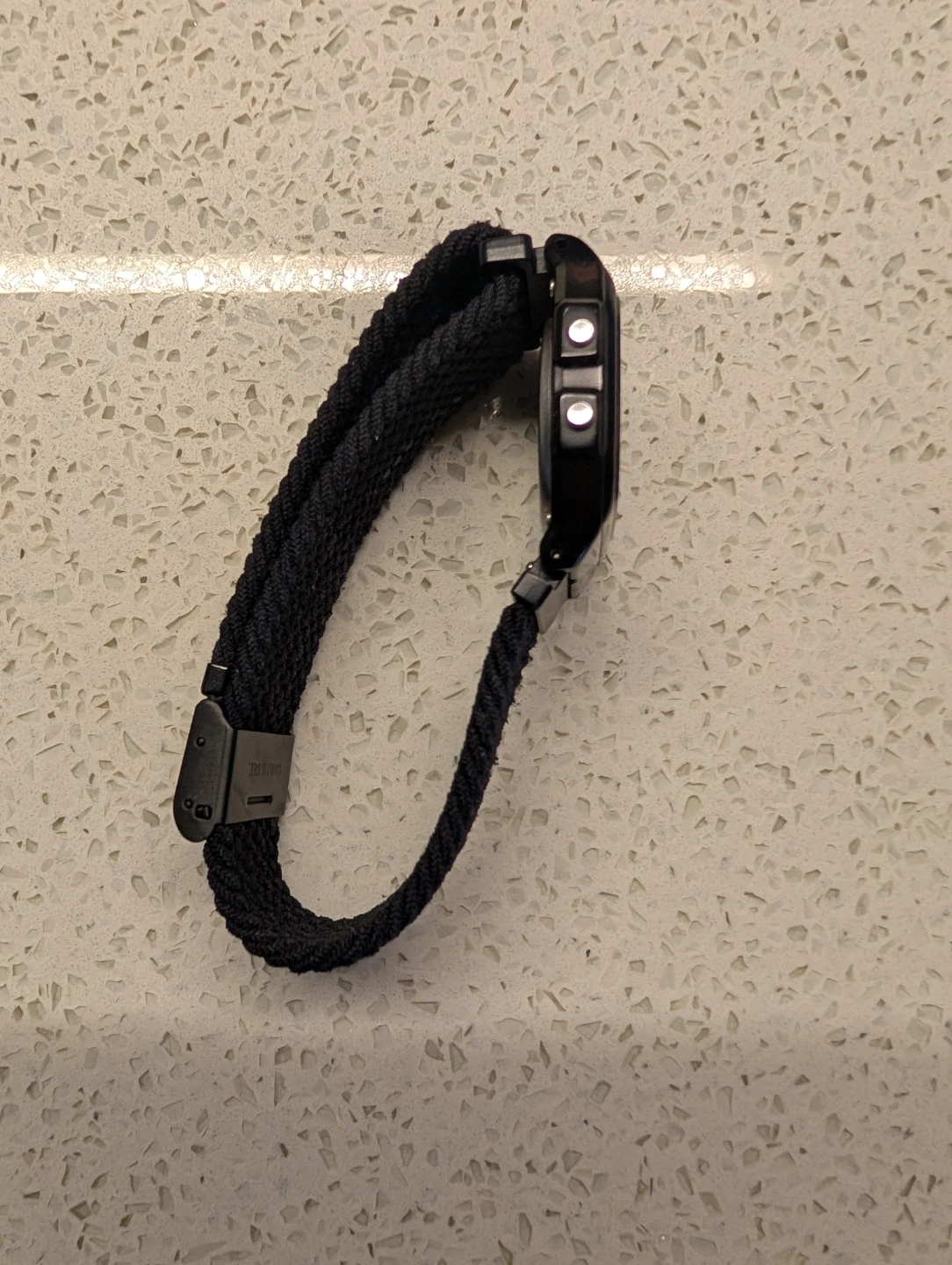 This is a Casio F-91W alarm chronograph digital watch. It features a black woven strap for comfort and durability. The watch has a clear digital display showing time, date, and alarm.