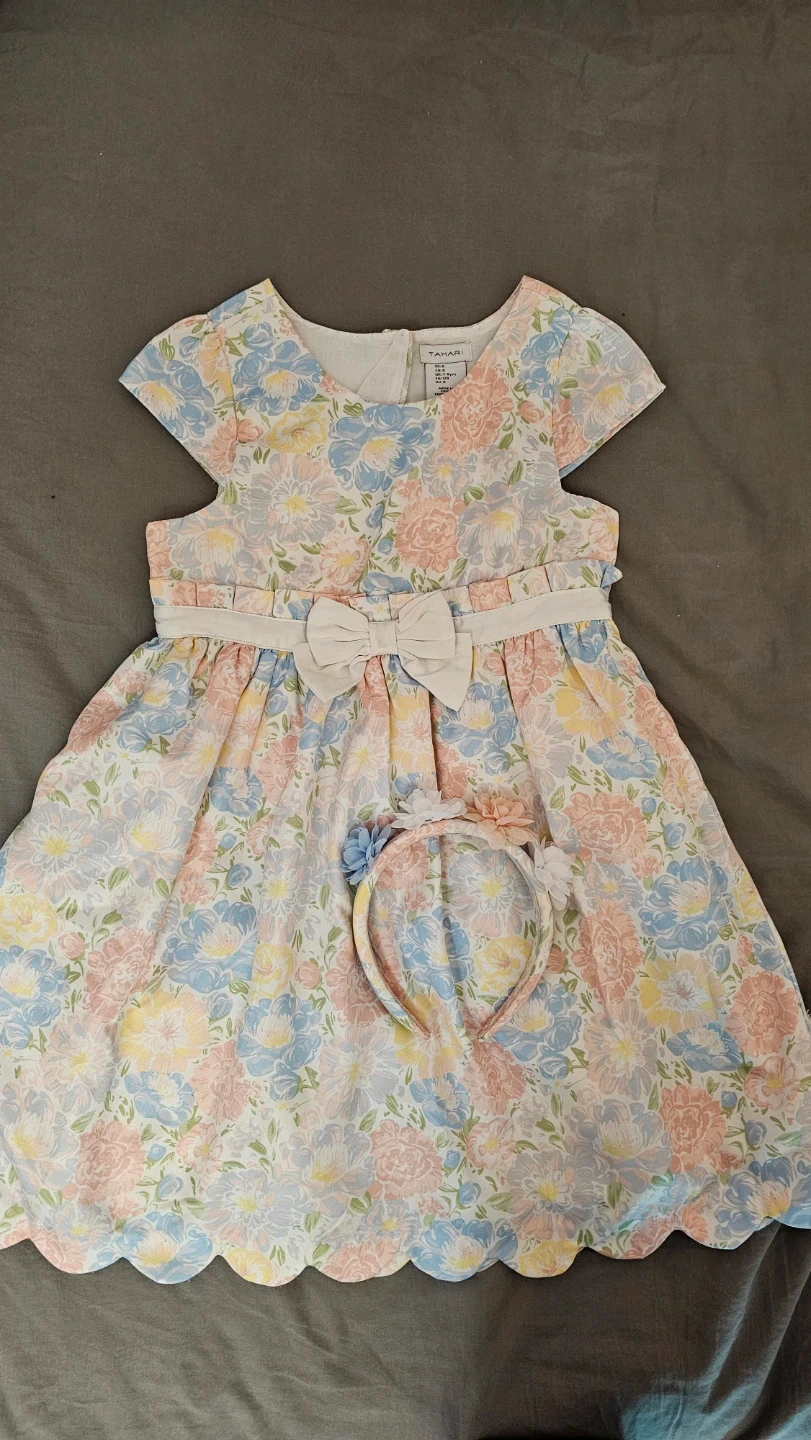 Beautiful floral print dress for girls by Tahari. It features a scalloped hem and comes with a matching headband. Perfect for special occasions or everyday wear!