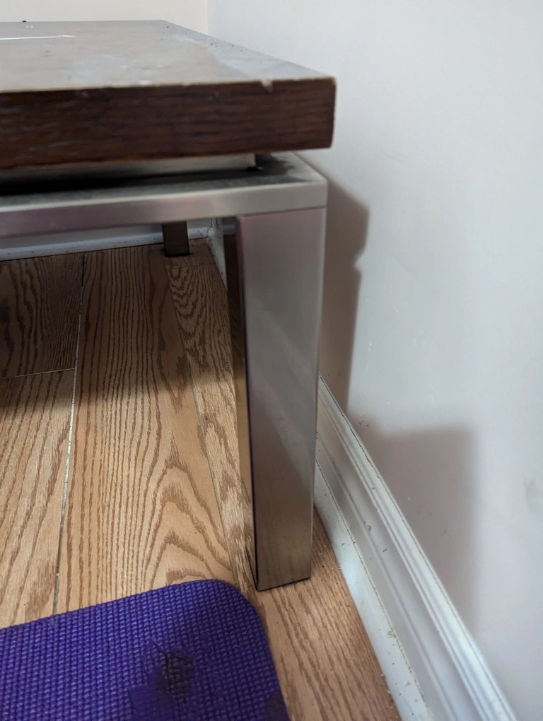 This coffee table has a wooden top and stainless steel legs.