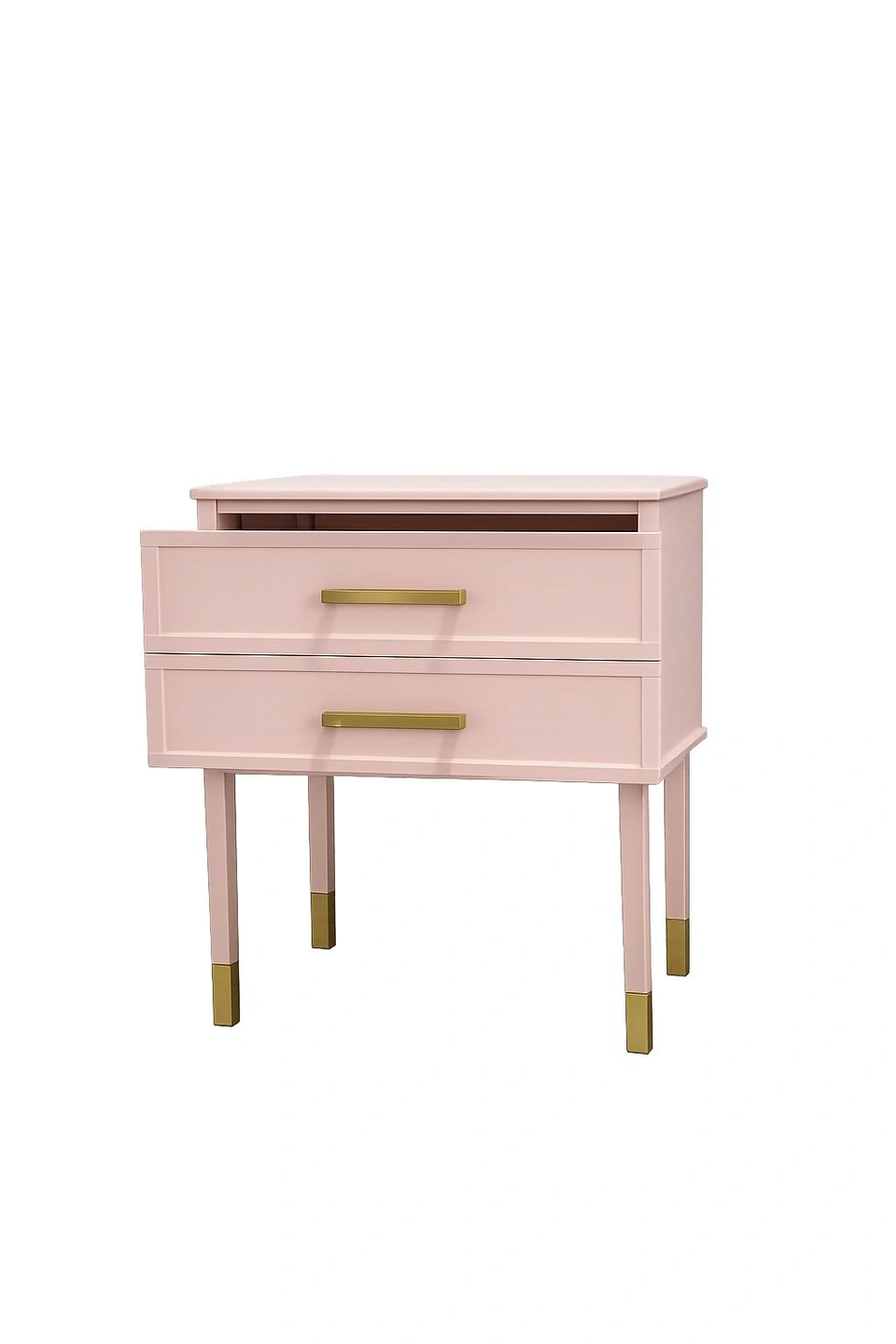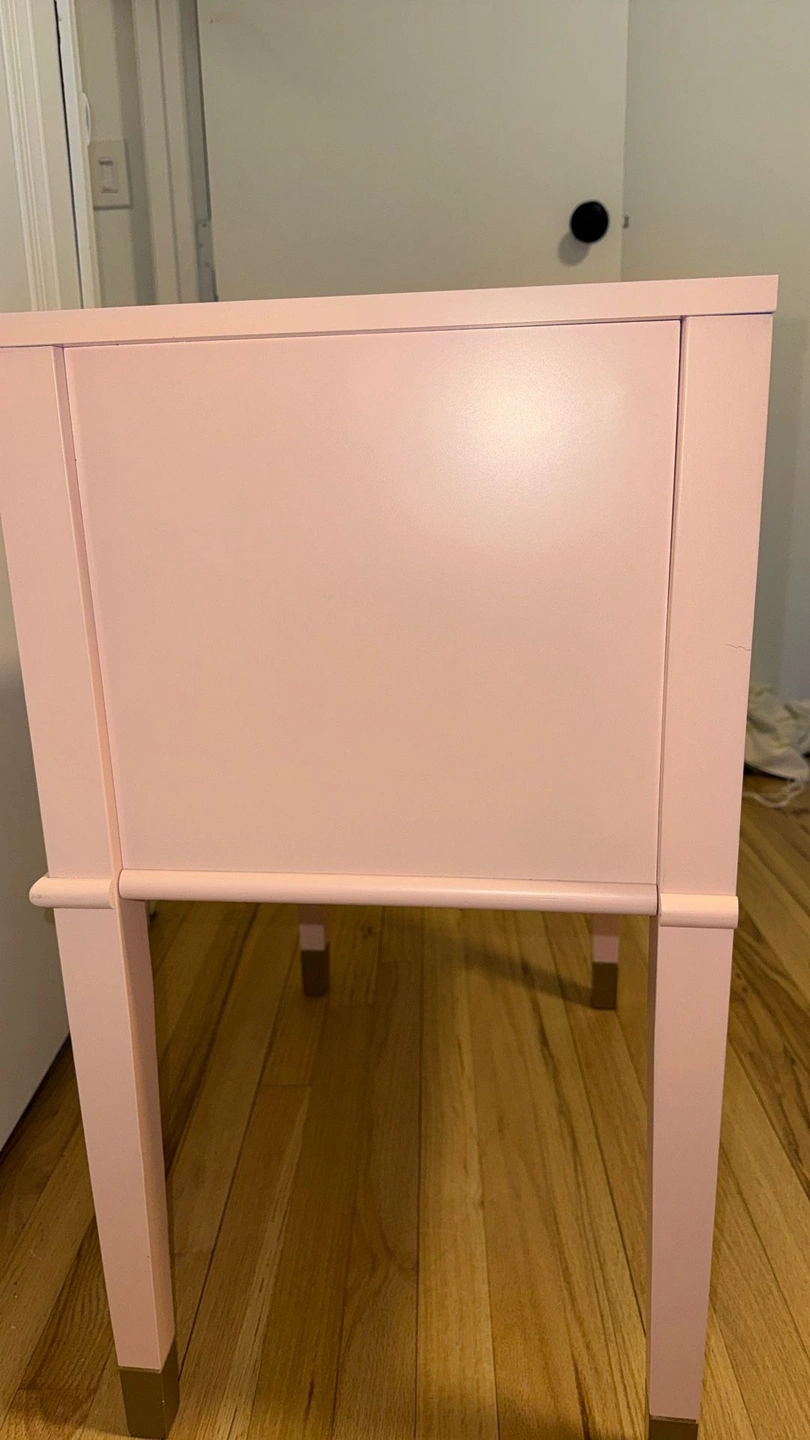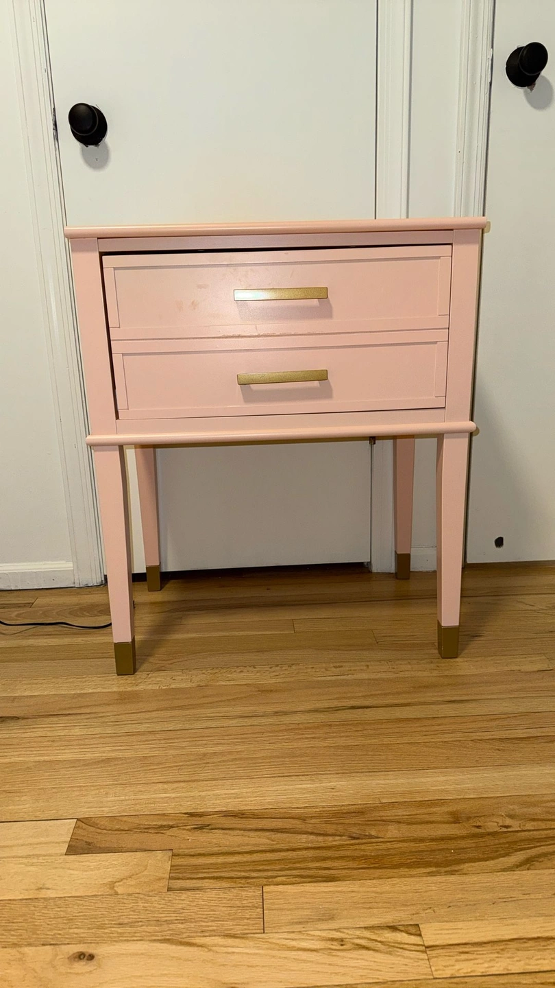 Lightly used blush pink bedside table/nightstand with a clean, modern look. Features smooth-gliding drawers for storage, gold/brass-tone handles, and matching gold leg caps for a polished finish. Sturdy, sits level, and looks great as a nightstand, end table, or small accent piece. Condition: Very good—light cosmetic wear from normal use (see photo). Pickup: Huntington