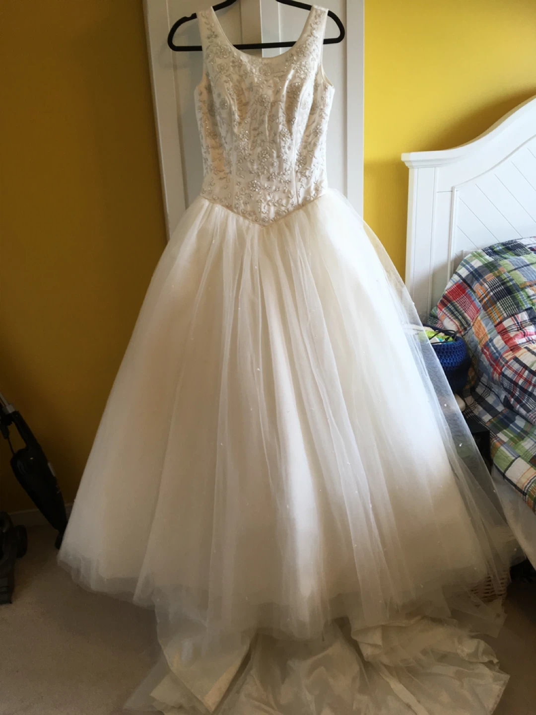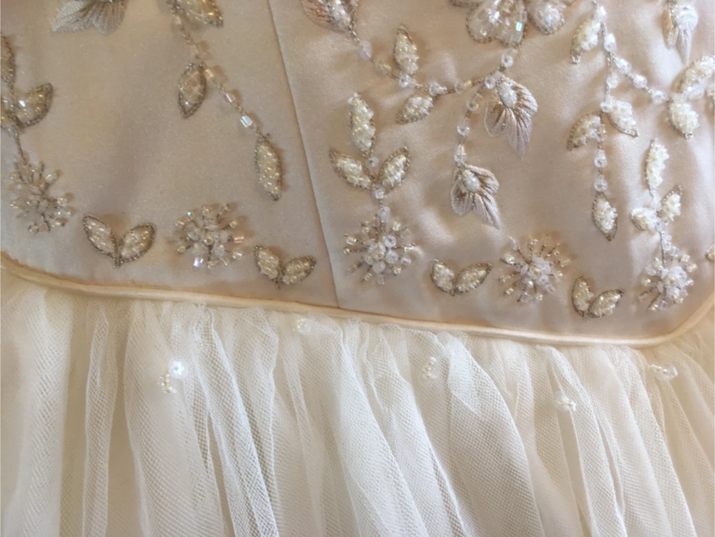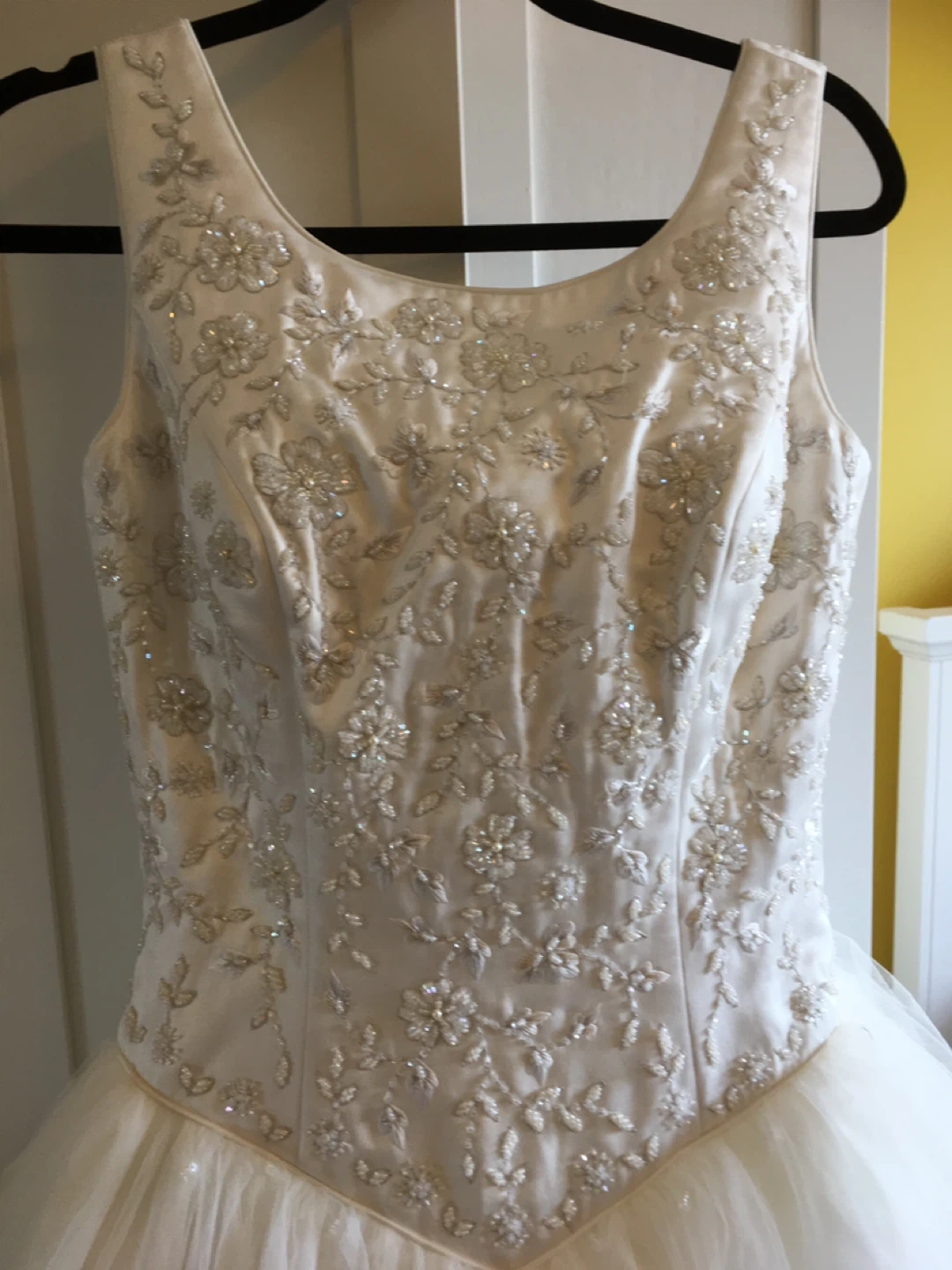 Beautiful sleeveless wedding dress with intricate beadwork on the bodice. It features a full tulle skirt with scattered pearl accents. This dress is ready for your special day!
